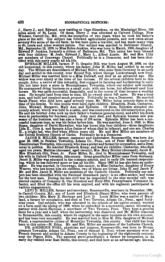Photo taken about 1948 when Sylvester and Henrietta Seymore purchased what had once been Jacob Miller's Funeral Parlor. This structure and those around it were built by Captain Jacob Miller after his return from the Civil War. Mr. Miller was a carpenter, furniture and casket maker, undertaker and farmer. The bottom floor of this building was the funeral parlor. The upstairs was the Miller's home. The famous John Burns, "Hero of Gettysburg," was prepared for burial here. Mr. Miller's furniture and casket factory was located directly across Maple Street from this brick structure. Empty, unused and deteriorating, the clapboard sided building still stands today. (2/12/16)