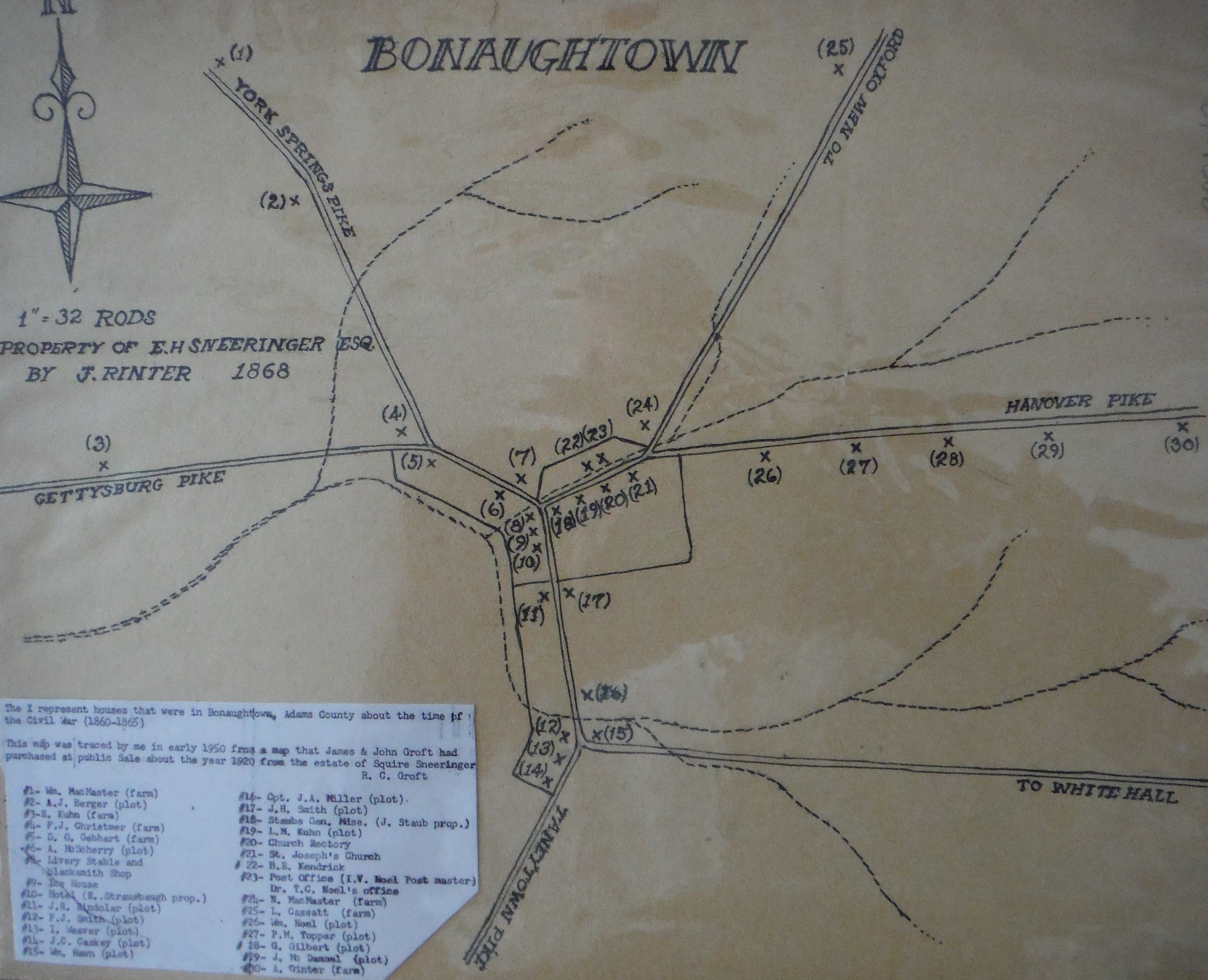 This map and notes were copied by Richard Groft (Maple St. Bonneauville, PA): Map Heading; Property of E. H. Sneeringer, Esq. By J. Rinter, 1868 "The "X" represents houses that were in Bonaughtown at about the time of the Civil War (1860-1865.)"