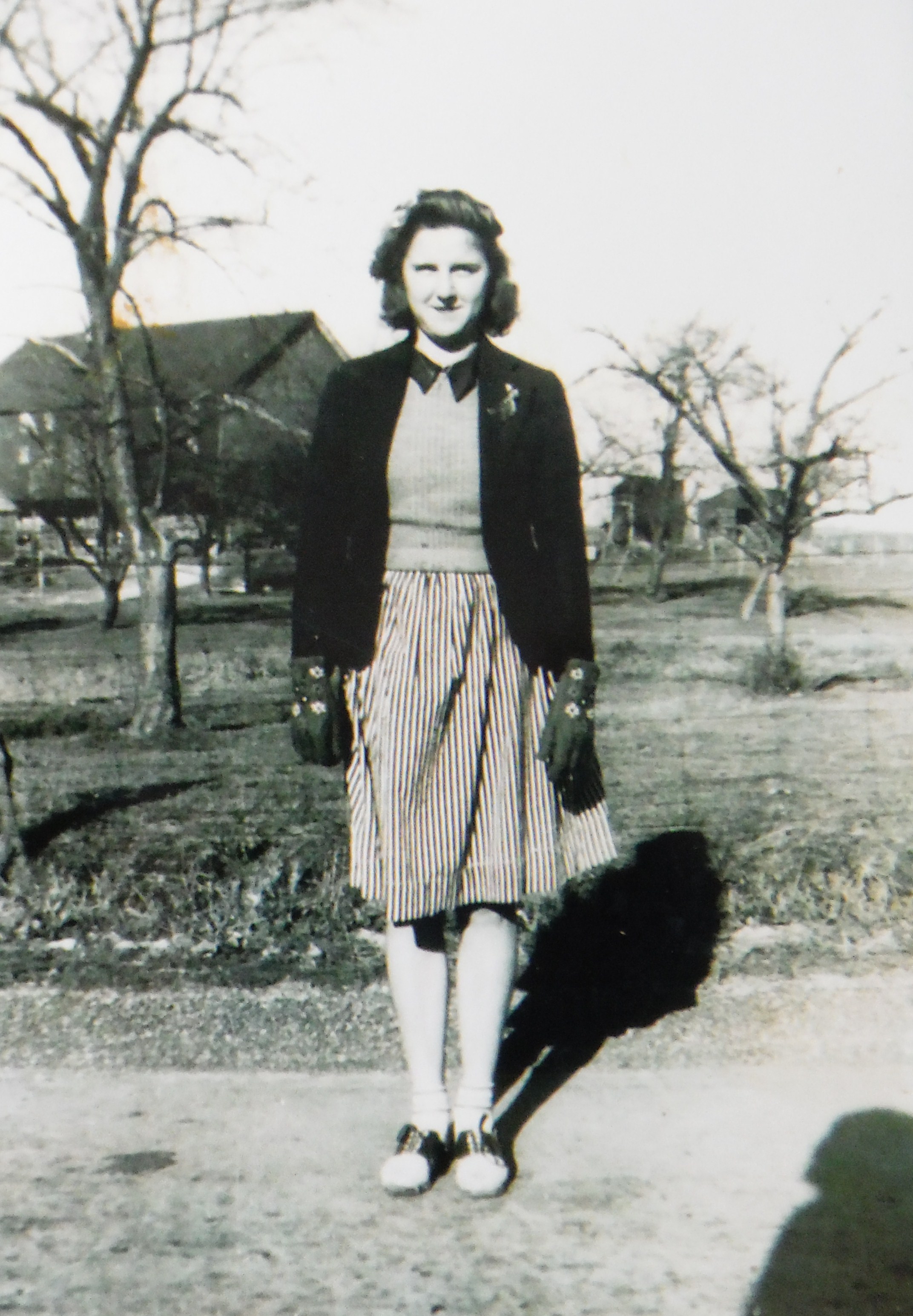 Theda Smith Henschke poses on Hanover St in Bonneauville. The apple orchard in the background was located on the east corner of the intersection of Cedar St. and the Hanover Road. In the background is the Ambrose and Bertha Myers farm.