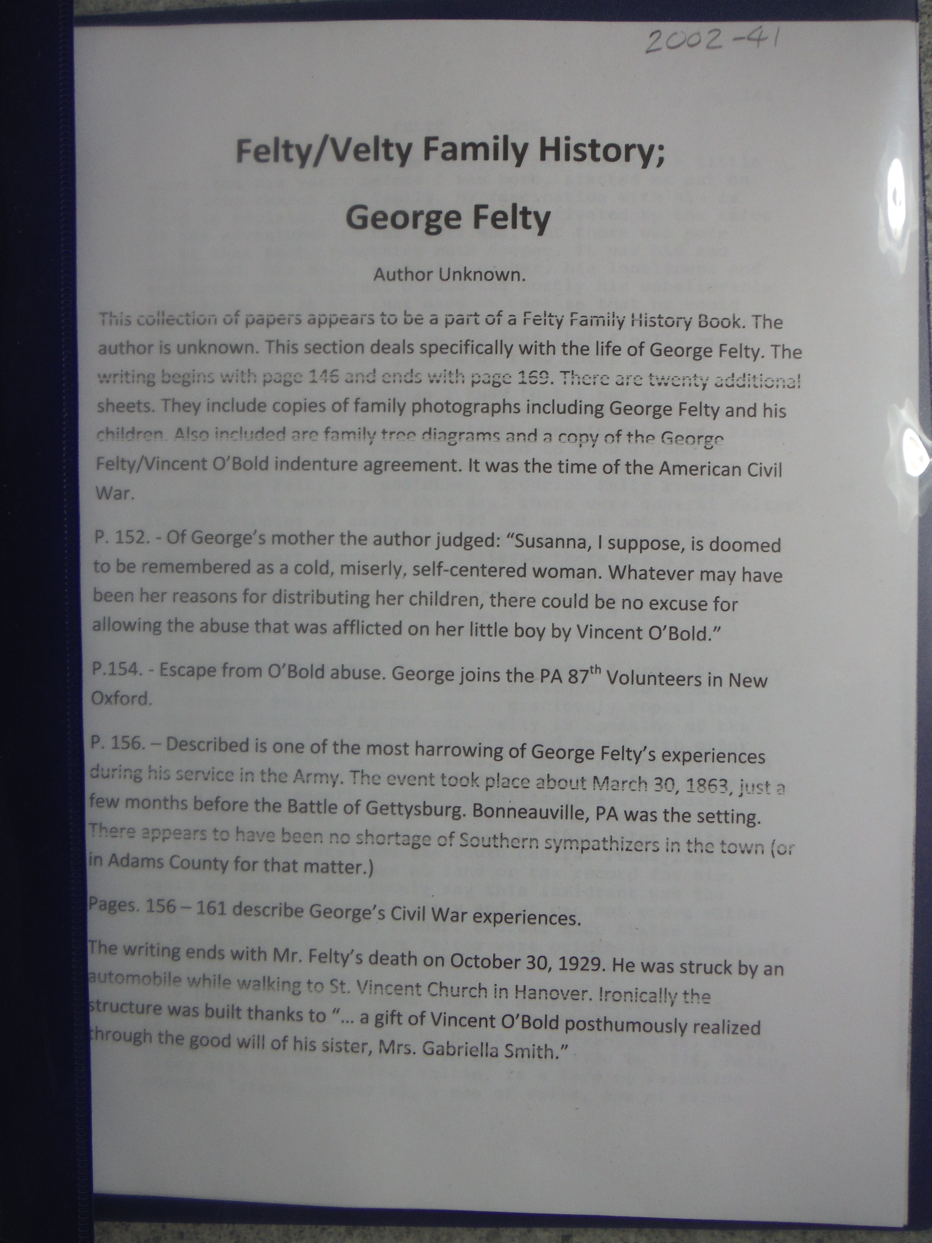 This collection of papers appears to be a part of a Felty Family History Book. The author is unknown. This section deals specifically with the life of George Felty. The writing begins with page 146 and ends with page 169. There are twenty additional sheets. They include copies of family photographs including George Felty and his children. Also included are family tree diagrams and a copy of the George Felty/Vincent O'Bold indenture agreement. It was the time of the American Civil War.