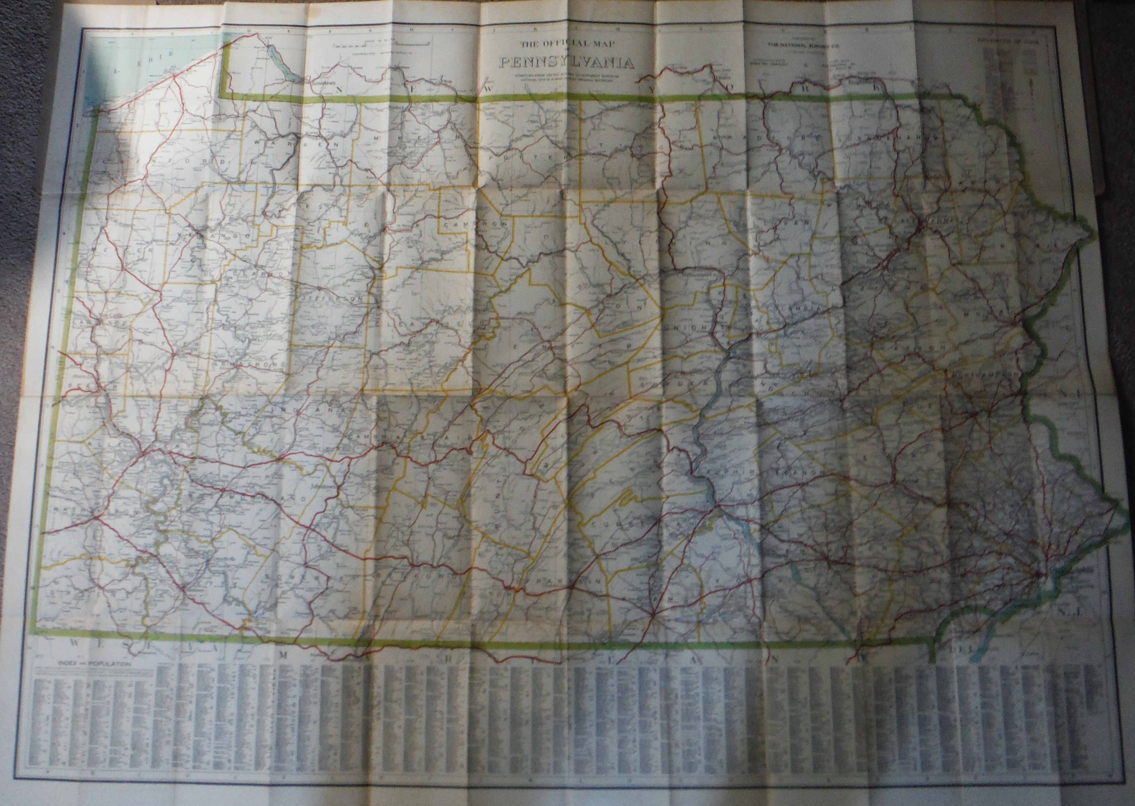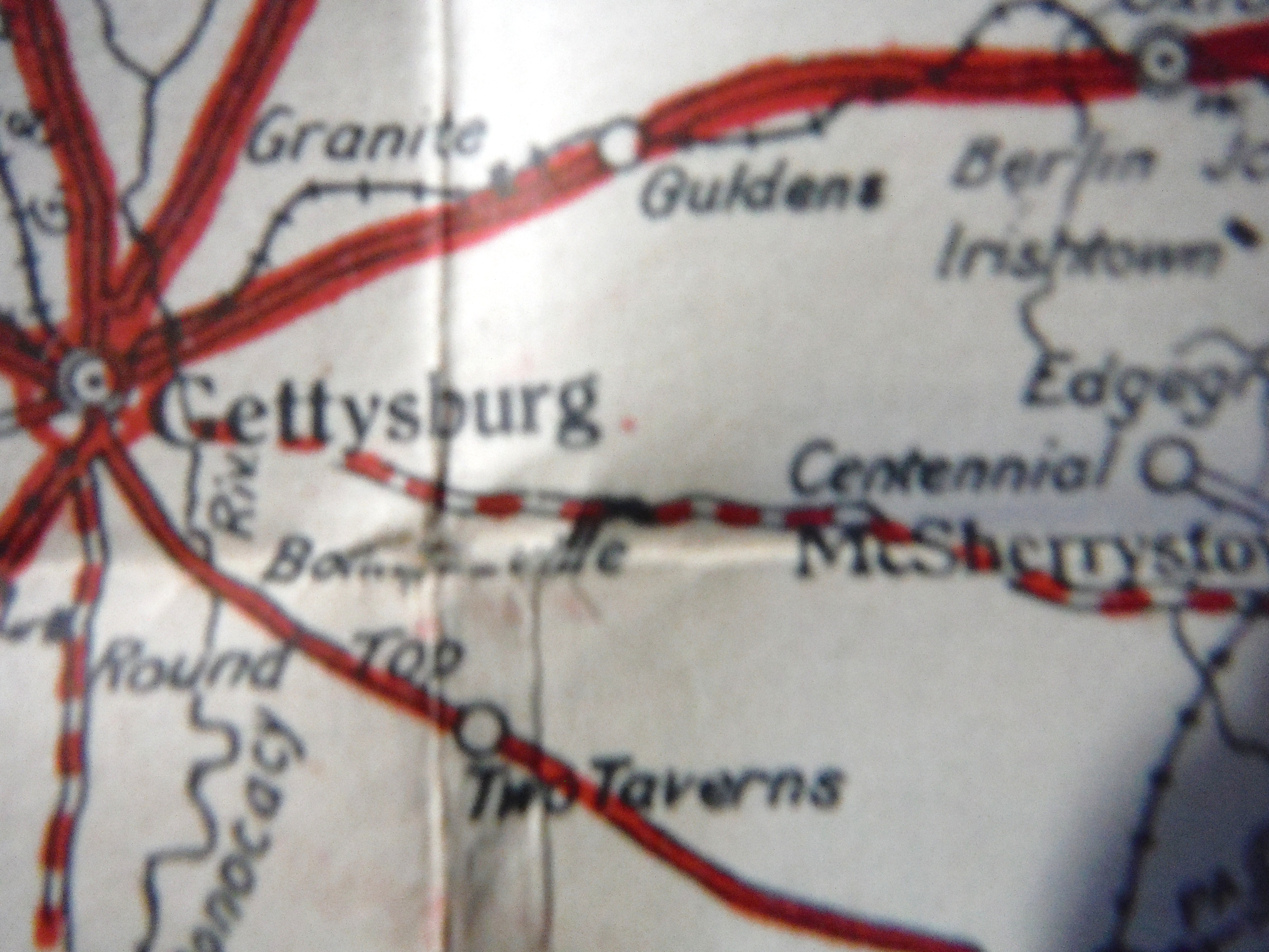 The National Survey Co., Philadelphia, PA. Map undated; This folded, hardback cover map depicts routes, railway stations, villages and waterways for all of Pennsylvania. Bonneauville is indicated but with no features other than RT. 116. The name is rendered nearly illegible by it's location on one of the map folds.