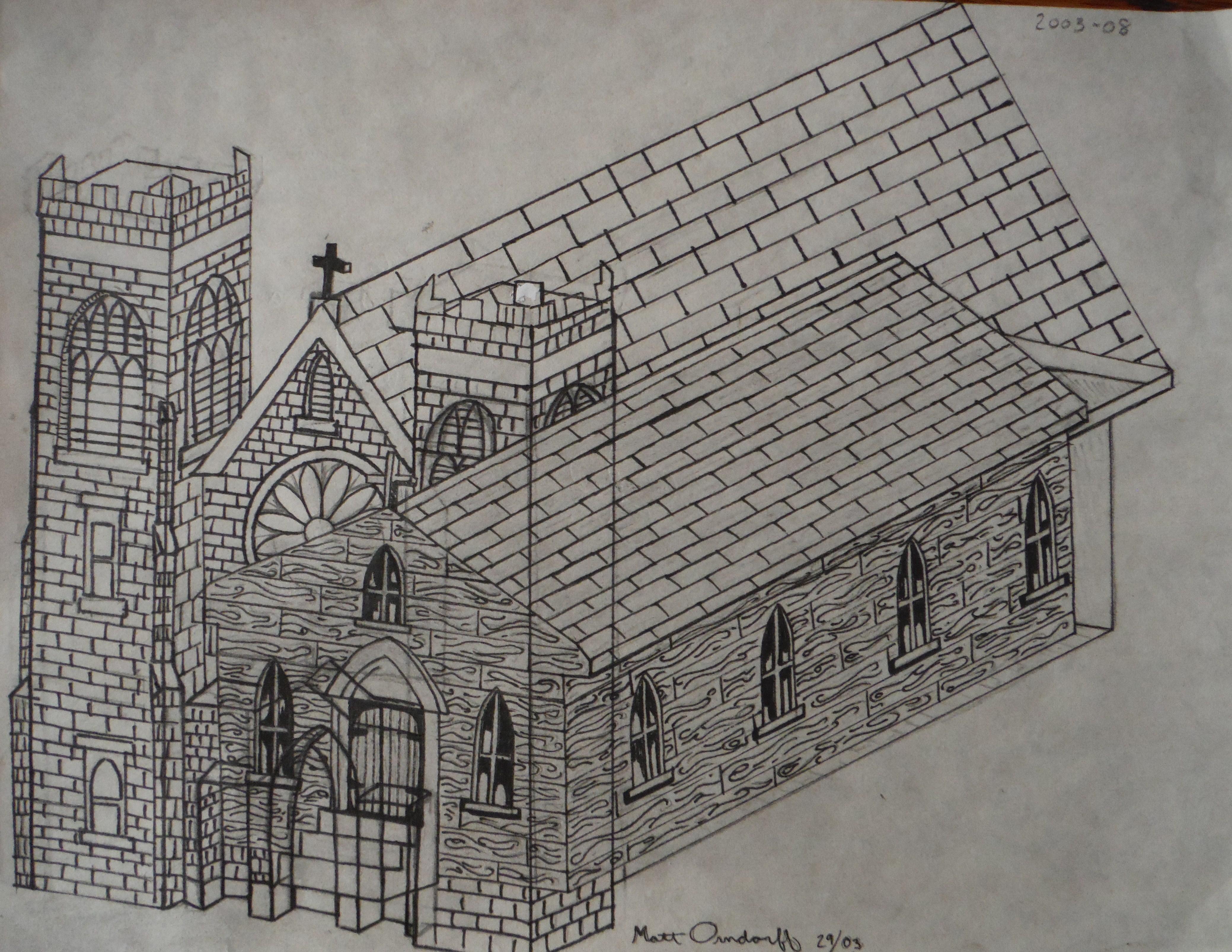 In this original pen and ink sketch, Matthew Orndorff spans nearly 150 years of architectural change. The original St. Joseph's Church was built of wood in 1859 by a community of workers who could ill afford a masonry structure. Within 50 years, the roof had been removed from the original building and a new brick church built around the existing one.