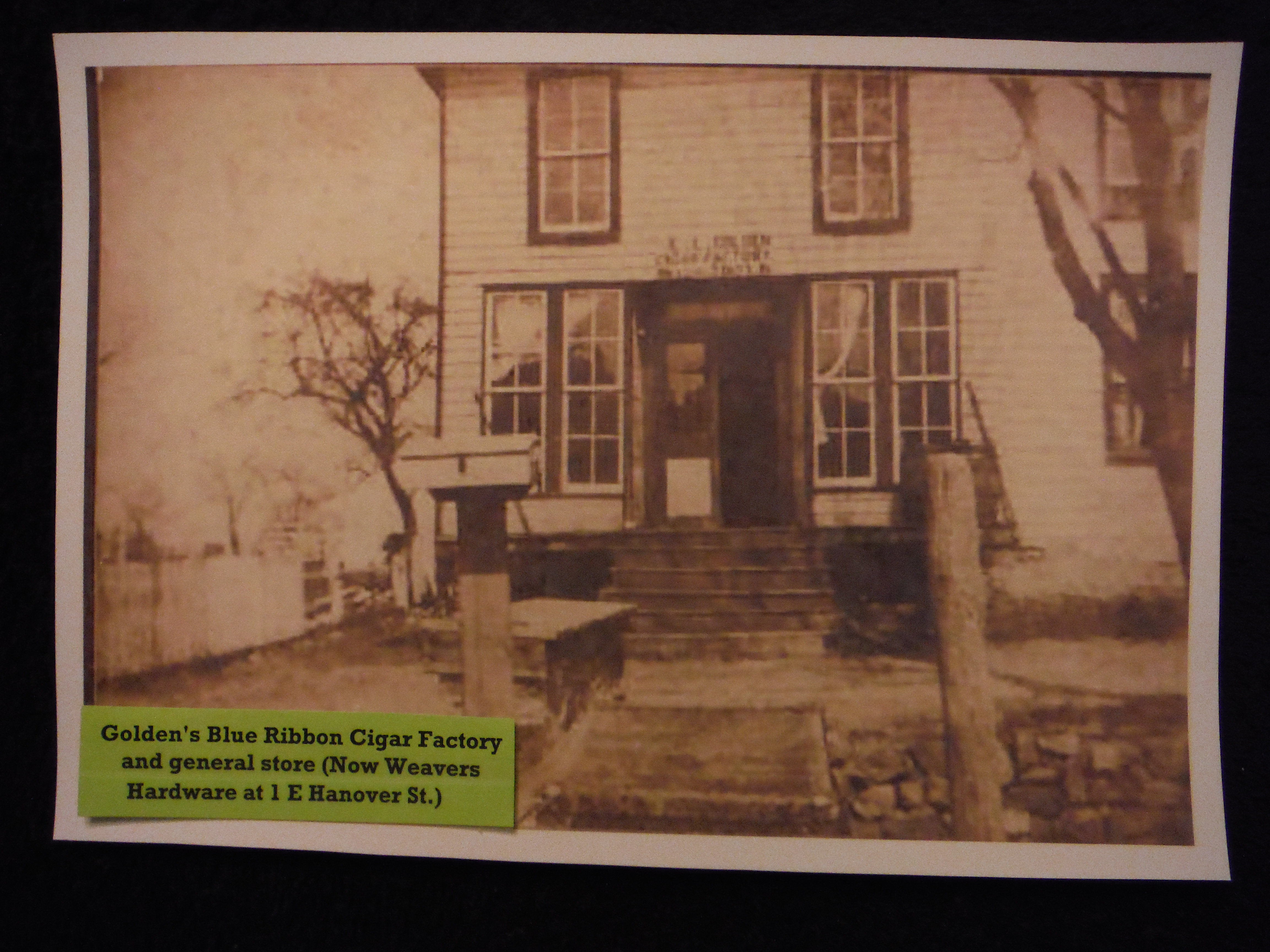 This building stands at 1 E. Hanover Street. It was constructed very early in the 20th Century by the Emory L. Golden Family. The Golden's produced famous Blue Ribbon Cigars and had outgrown their former location across the street at 1 W. Hanover St. This structure housed a general store on the lower floor and a cigar production facility upstairs. Note the footbridge over Chicken Run in the foreground.