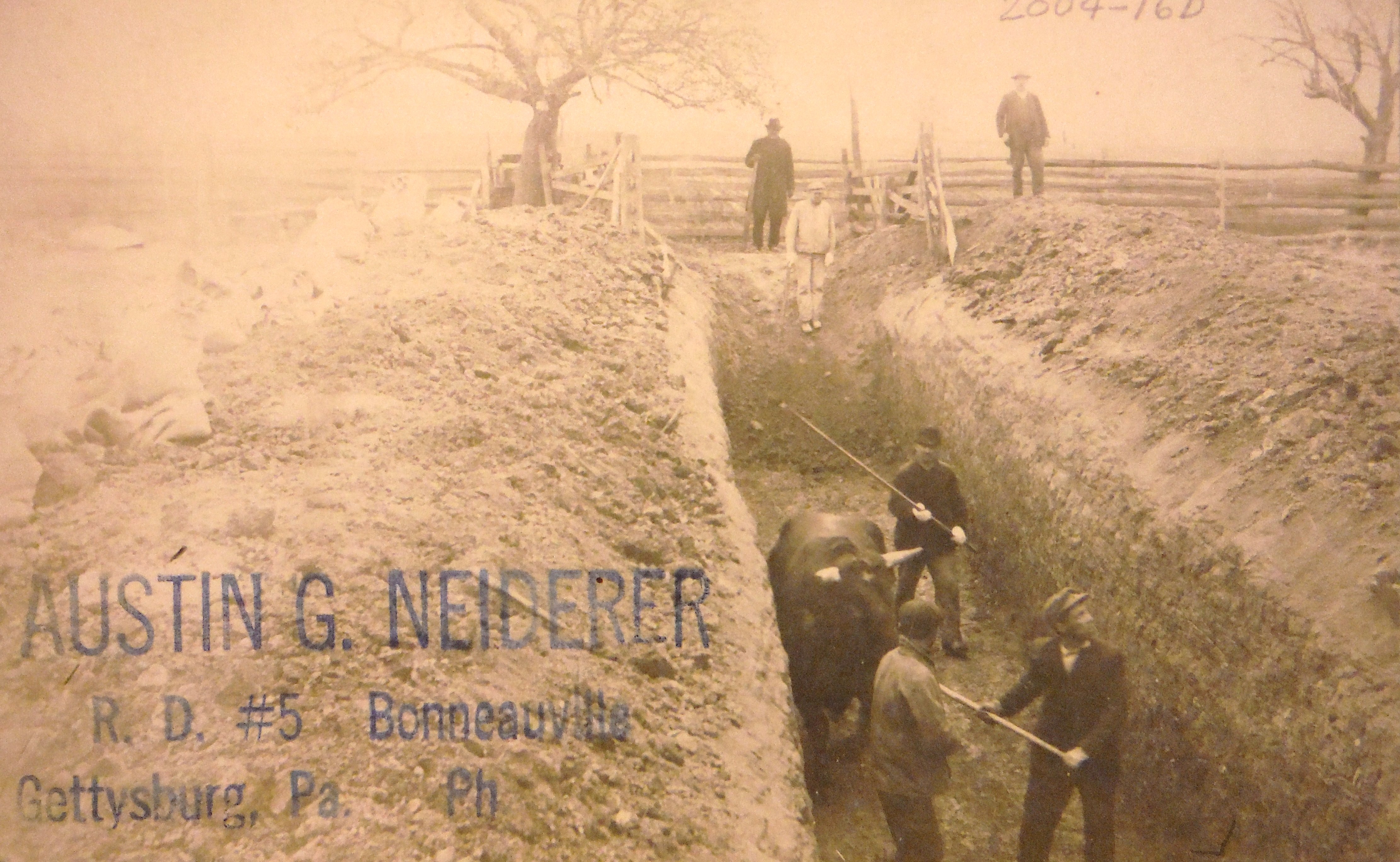 Austin Neiderer was a Bonneauville businessman. The work must have impressed him since he used this photo for advertising. The location and purpose of the trench is unknown.