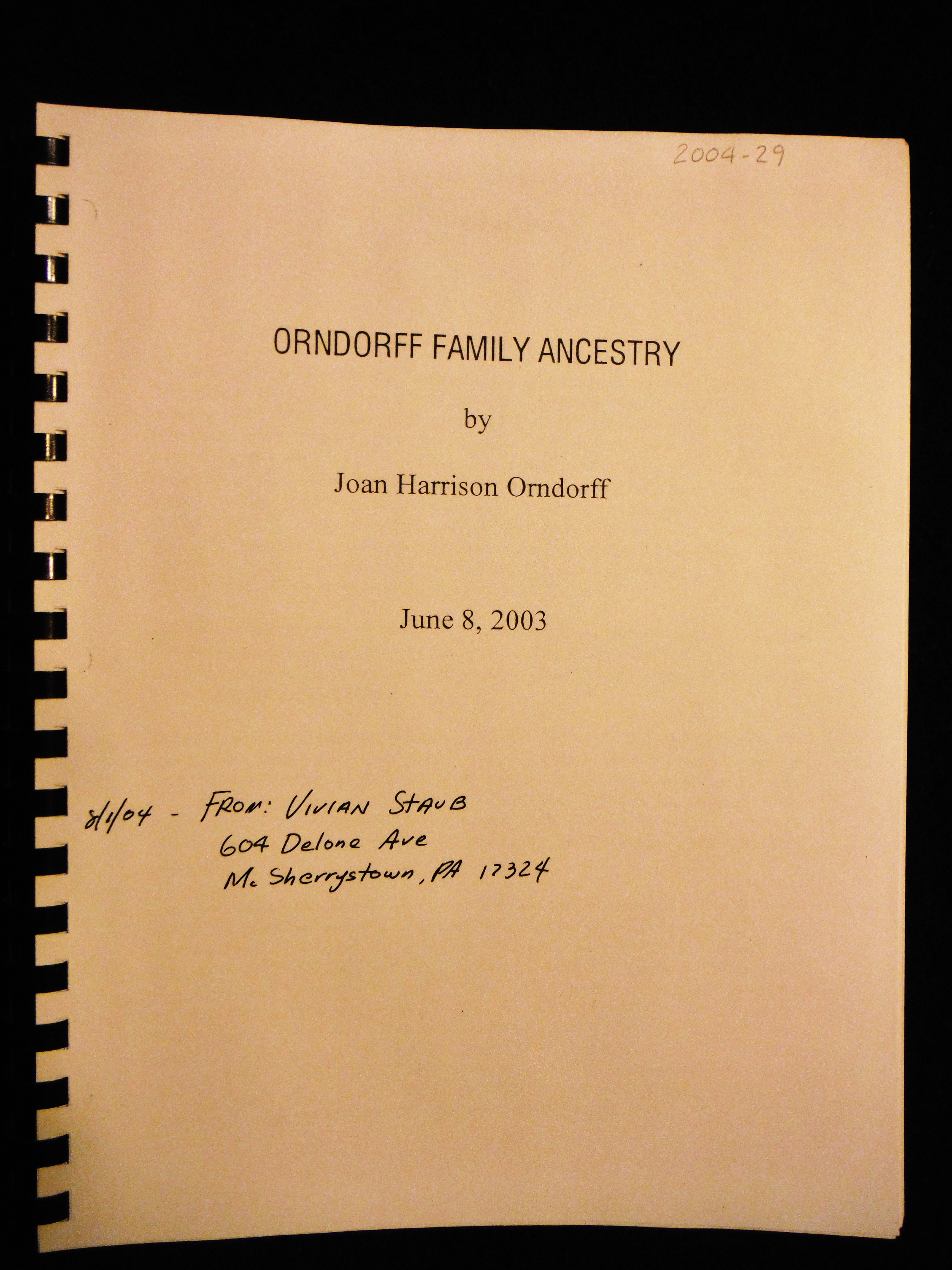 This book is dedicated to: William R. Orndorff, Annie C. Gebhart Orndorff, Mary Knox Family, Felicitas Staub Family, George N. Orndorff Family, Lucretia C. Breighner Family, Ruth T. Orndorff, Nelson J. Orndorff Family, Germanus W. Orndorff Family, Monica L. Long Family, Agnes D. Staub Family and Angela C. Spraglin Family.
