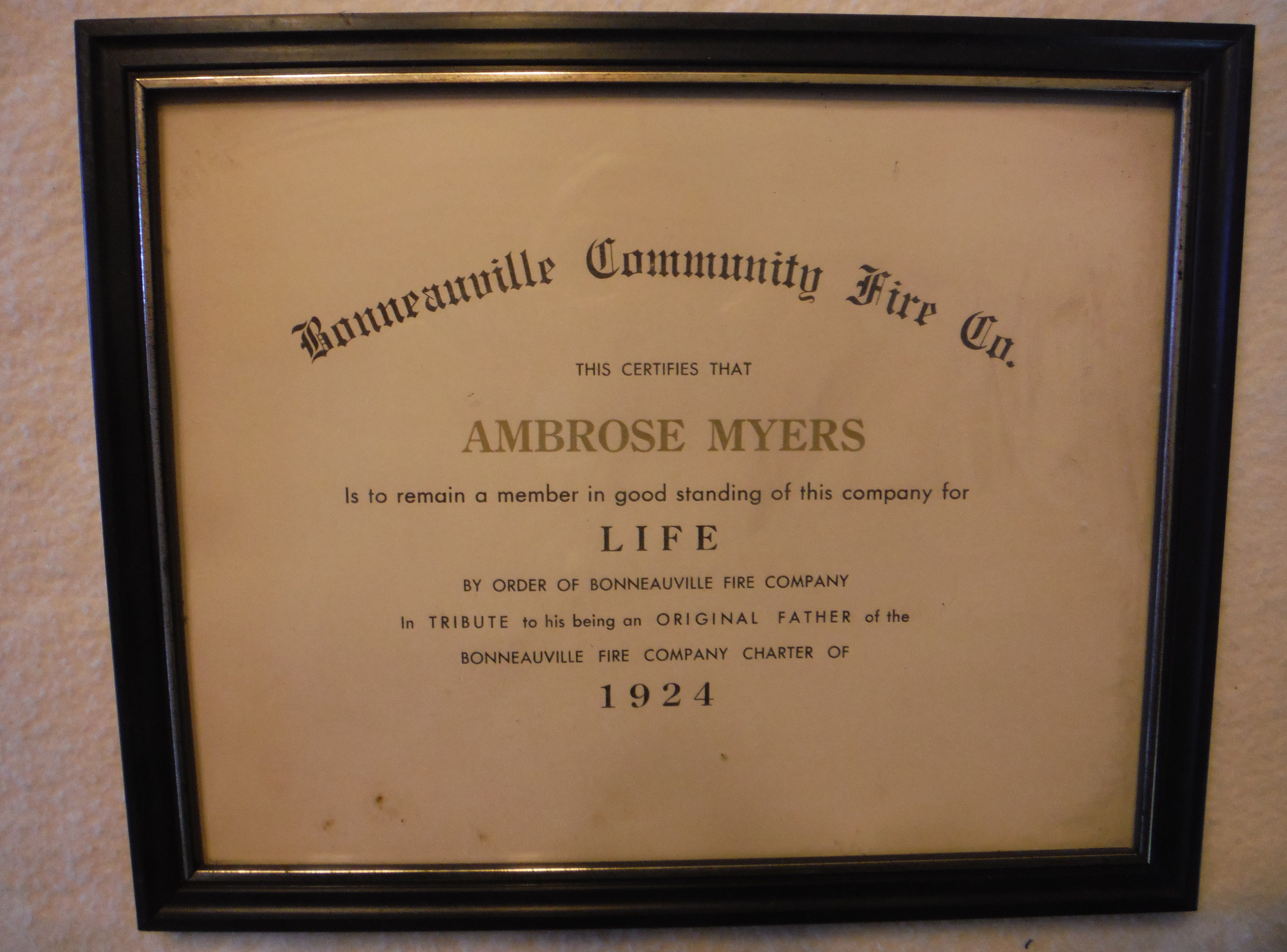 This certificate recognizes Ambrose Myers as being a life member (1924) and "Original Father" of Bonneauville's Fire Company.