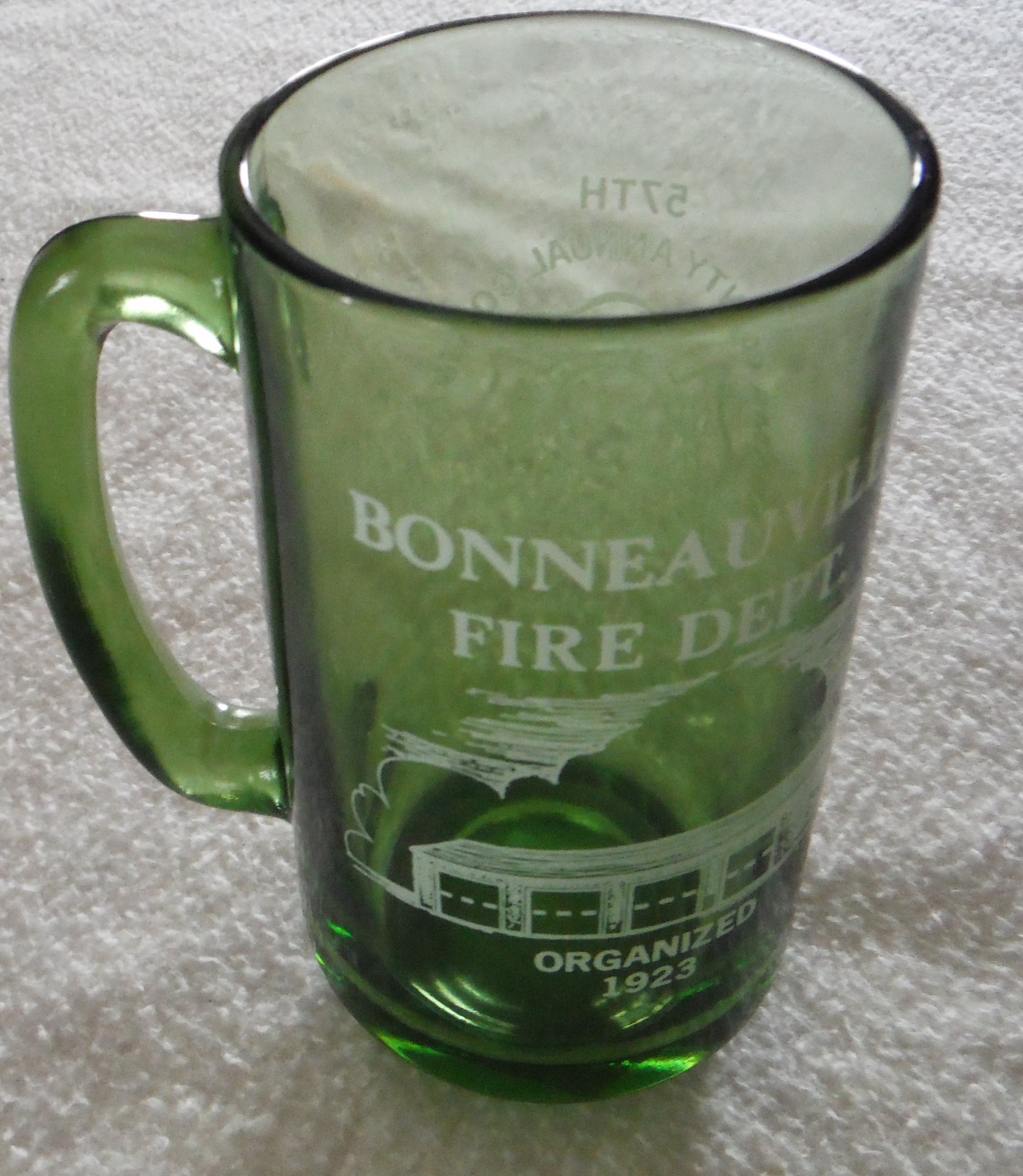 This green glass mug is one of a set of eight matching pieces. The mugs commemorate the 57th Adams County Vol. Fireman's Convention which was held at the Bonneauville Fire Dept., August 11, 1979.