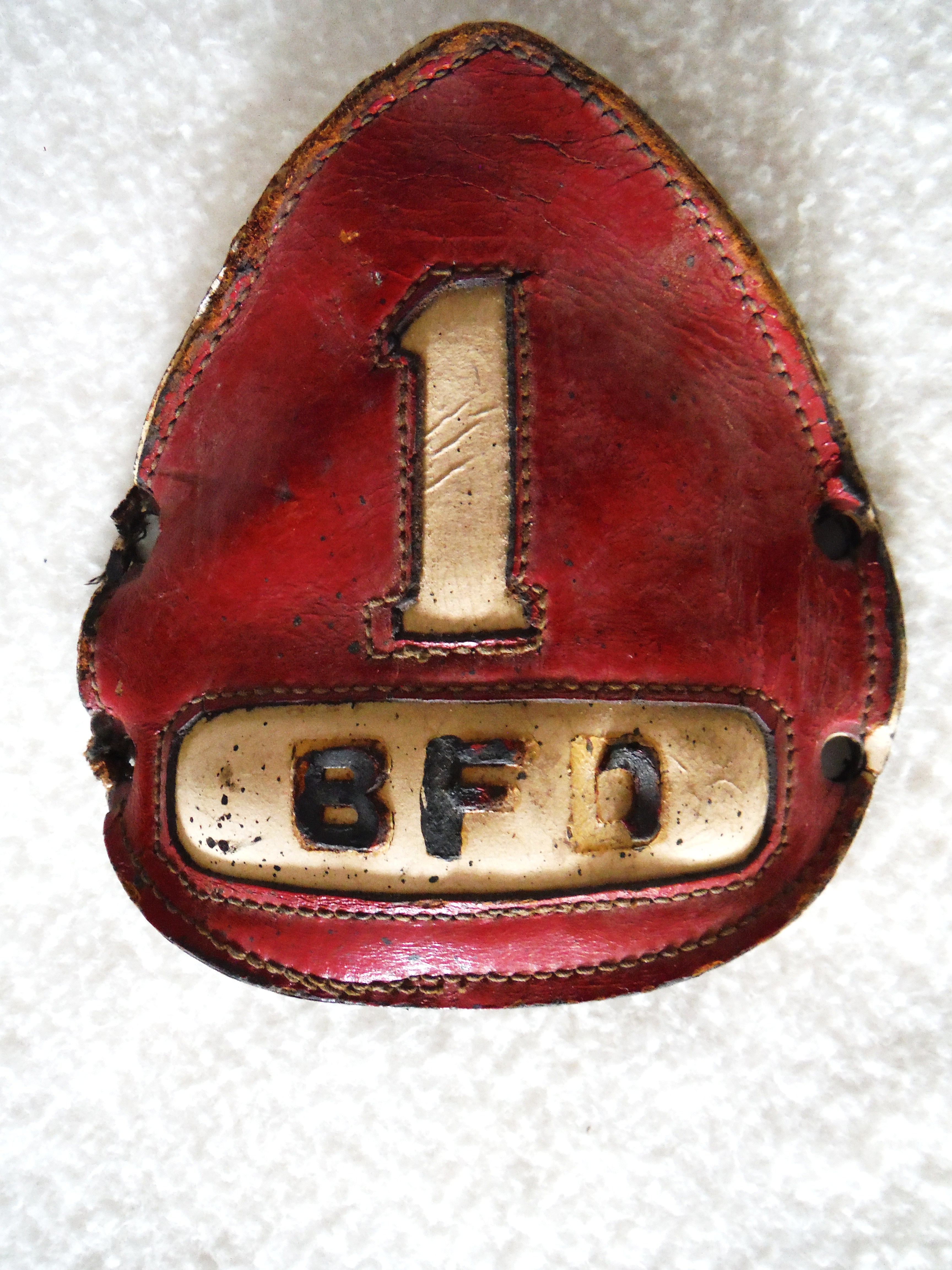 Early fire helmet front shield of red and white leather. From a Mr. Donnie Gantz sale of local fire company items at the Gettysburg Fire Hall, 2007. The piece was labeled "Bonneauville Fire Department" at the sale. (Note: Biglerville Fire Co. is identified as Co. No. 1.")