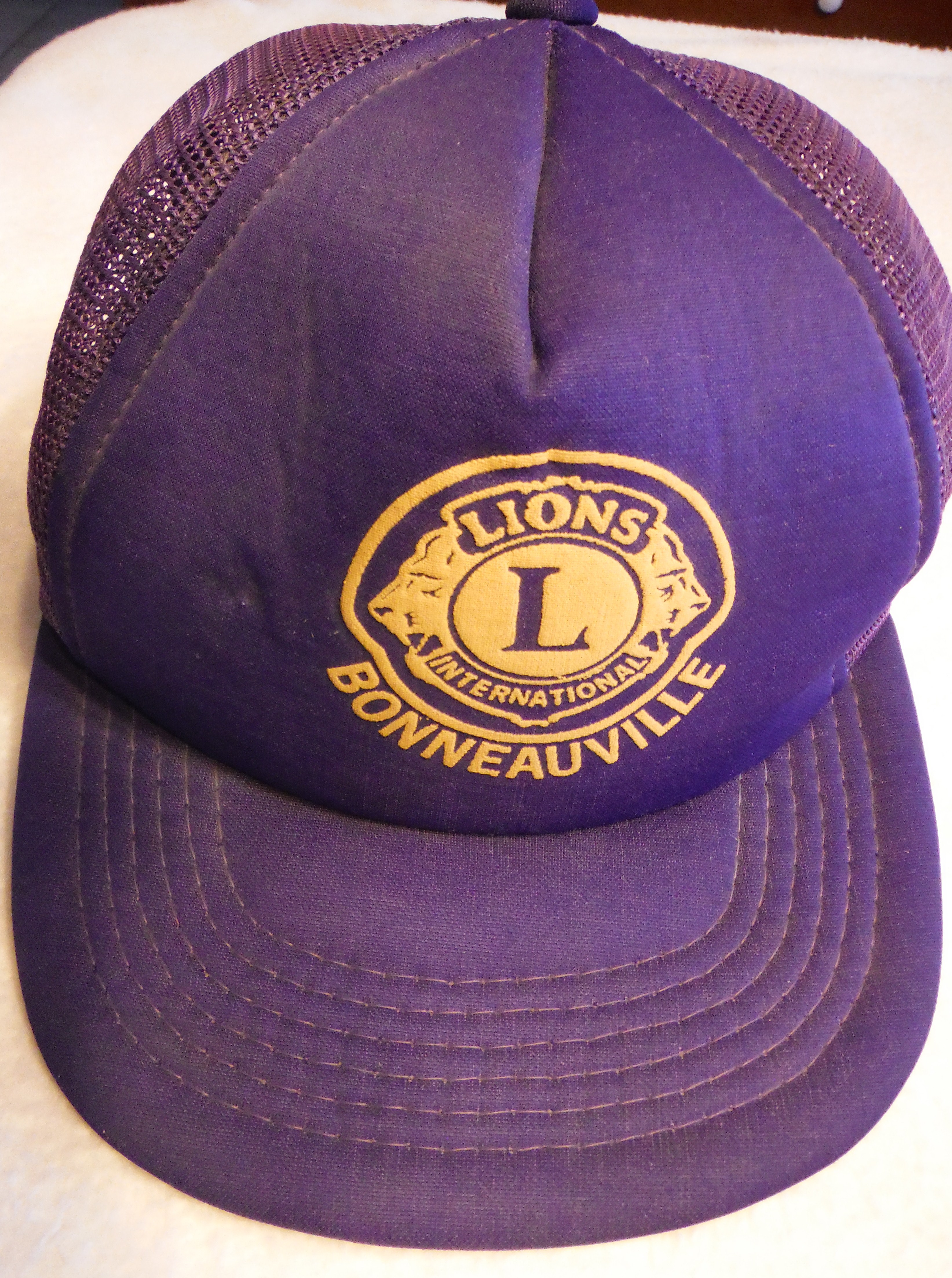 This cap advertises "Lions International, Bonneauville." The cap belonged to Sylvester Seymore, 15 Maple Street, who was a member of the group. Blue cap, yellow text.