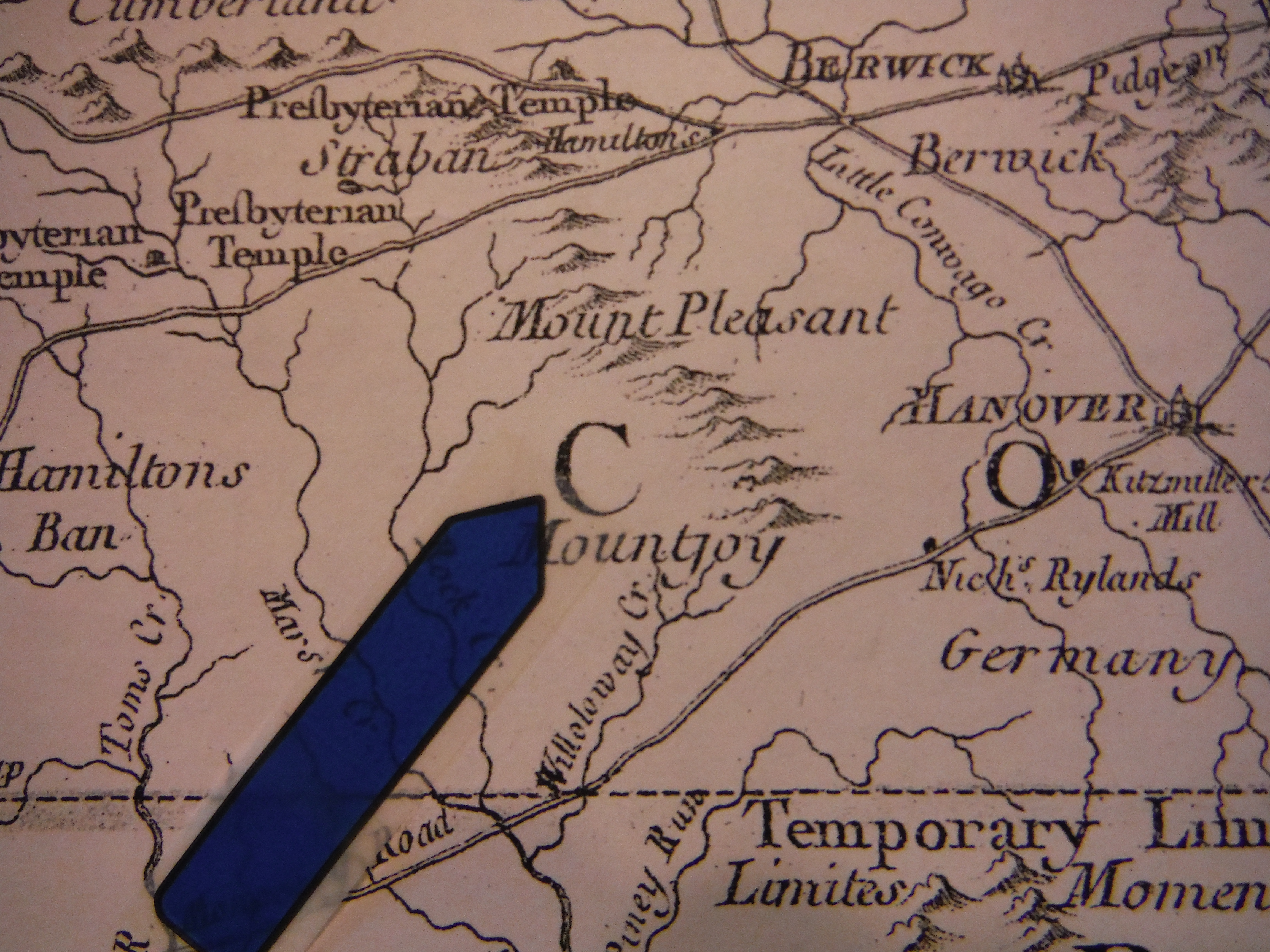 Blue arrow indicates the approximate location of the town of Bonneauville in Mount Pleasant Township.