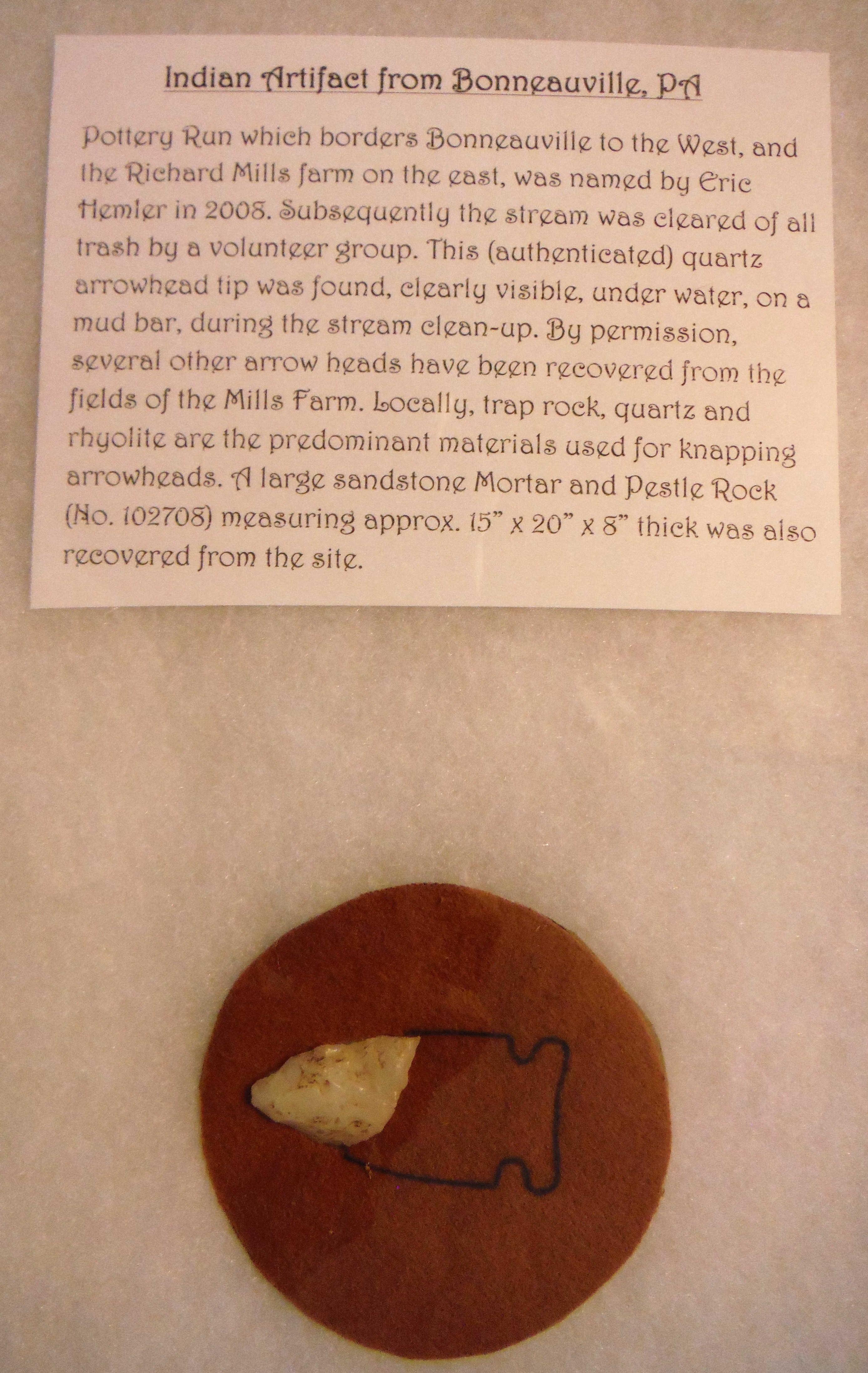 Arrowhead fragment from Pottery Run which borders Bonneauville to the west. See Catalog No. 2008-03 - Book; "Our Water is Critical to the Quality of Our Life." Compiled by Karl Orndorff and Eric Hemler in 2008. 85 sheets.