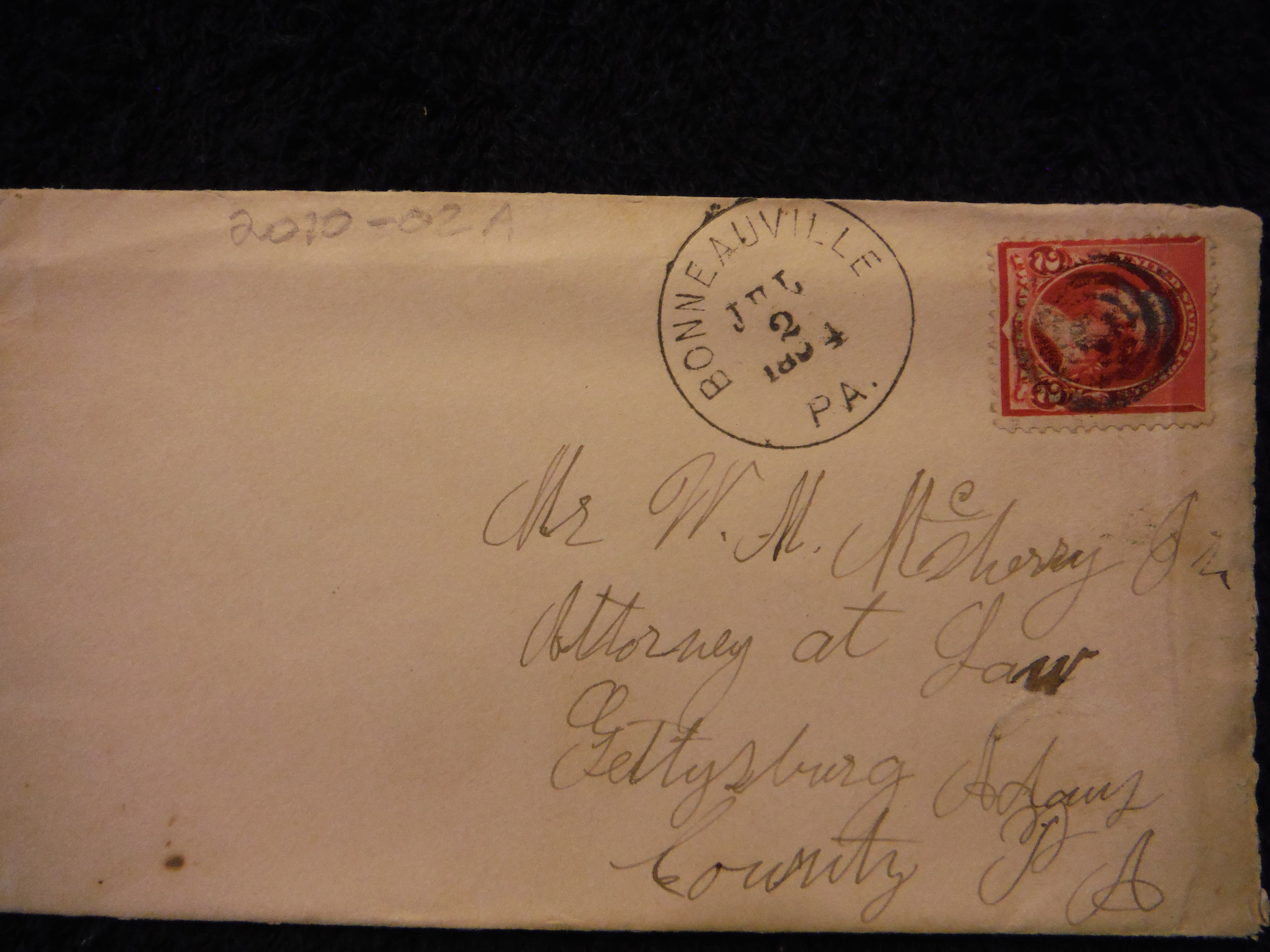 Postmarked at the Bonneauville Post Office in 1894, this letter is addressed to Attorney W. M. McSherry, of Gettysburg, PA.