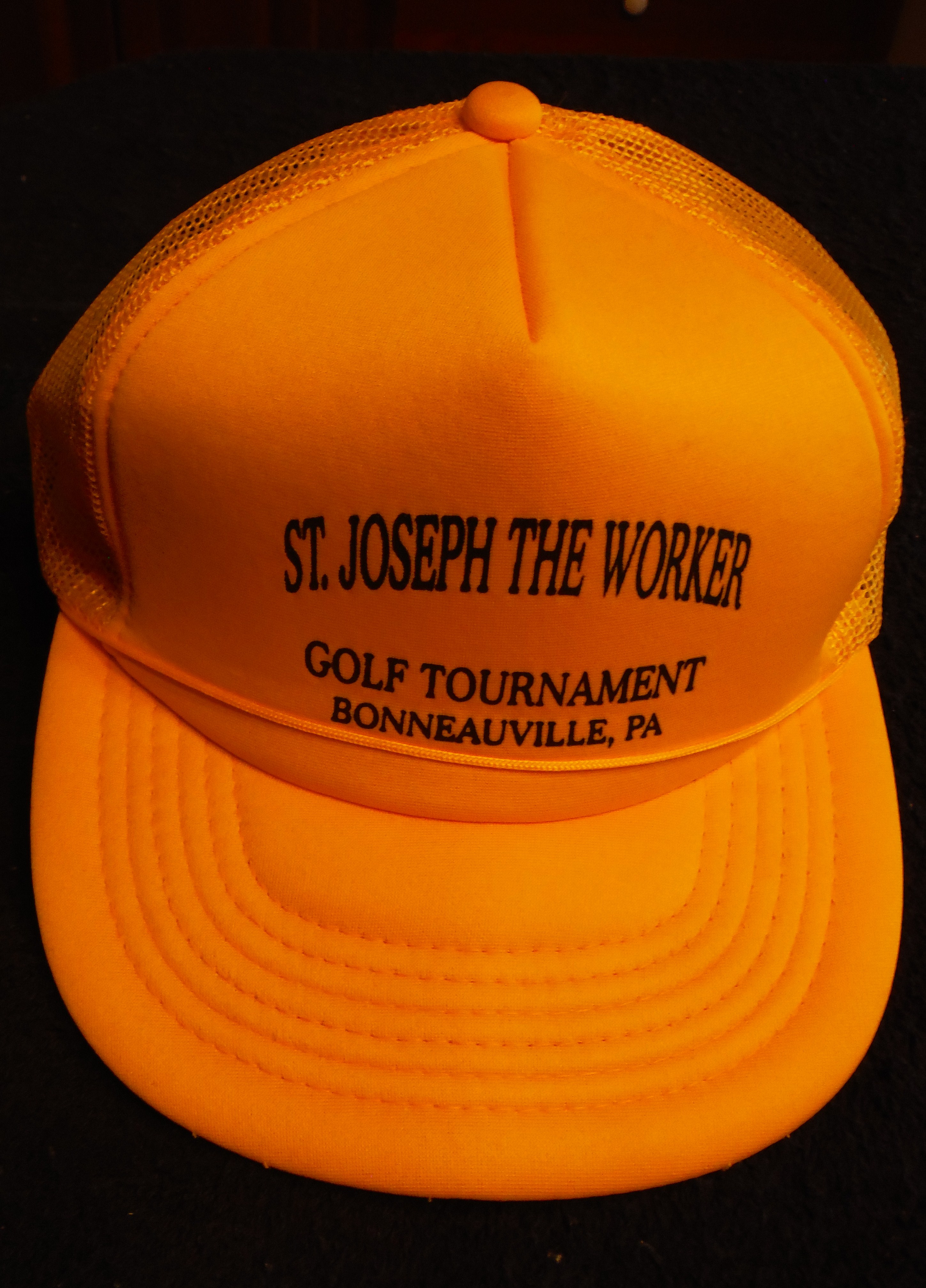 This cap advertises "St. Joseph the Worker, Golf Tournament, Bonneauville, PA." Yellow cap, black text.