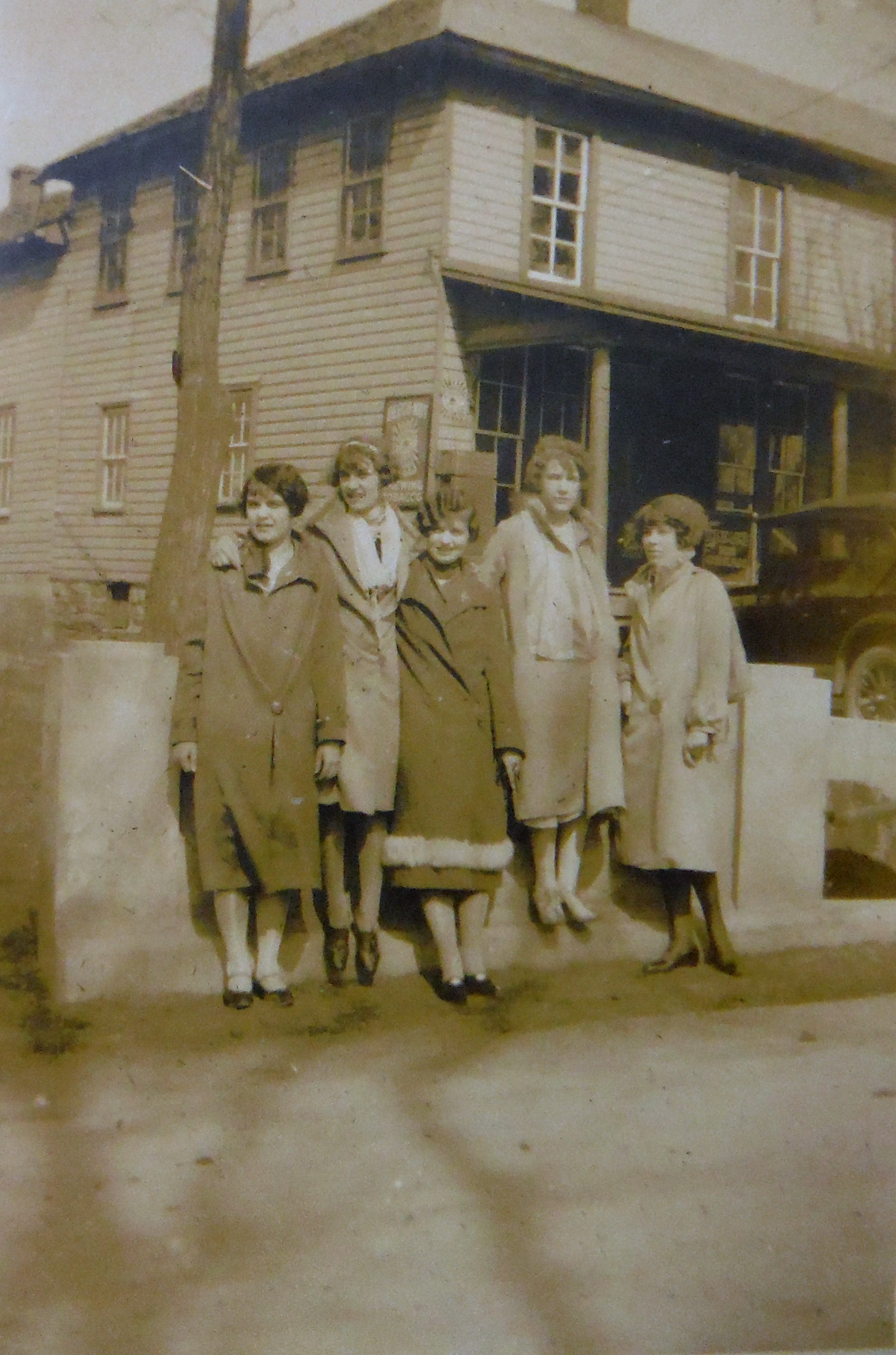 41-1- Five Girls at Chicken Run Bridge. In background, Noel's/Golden's General Store on the square in Bonneauville - now Weaver's Hardware and Groceries. The Golden's manufactured cigars upstairs and directly or indirectly ran a general store downstairs. Sign on West wall "Beechnut Chewing Tobacco" Signs in front windows "Newman's Ice Cream" and "Beechnut Tobacco." (KO)