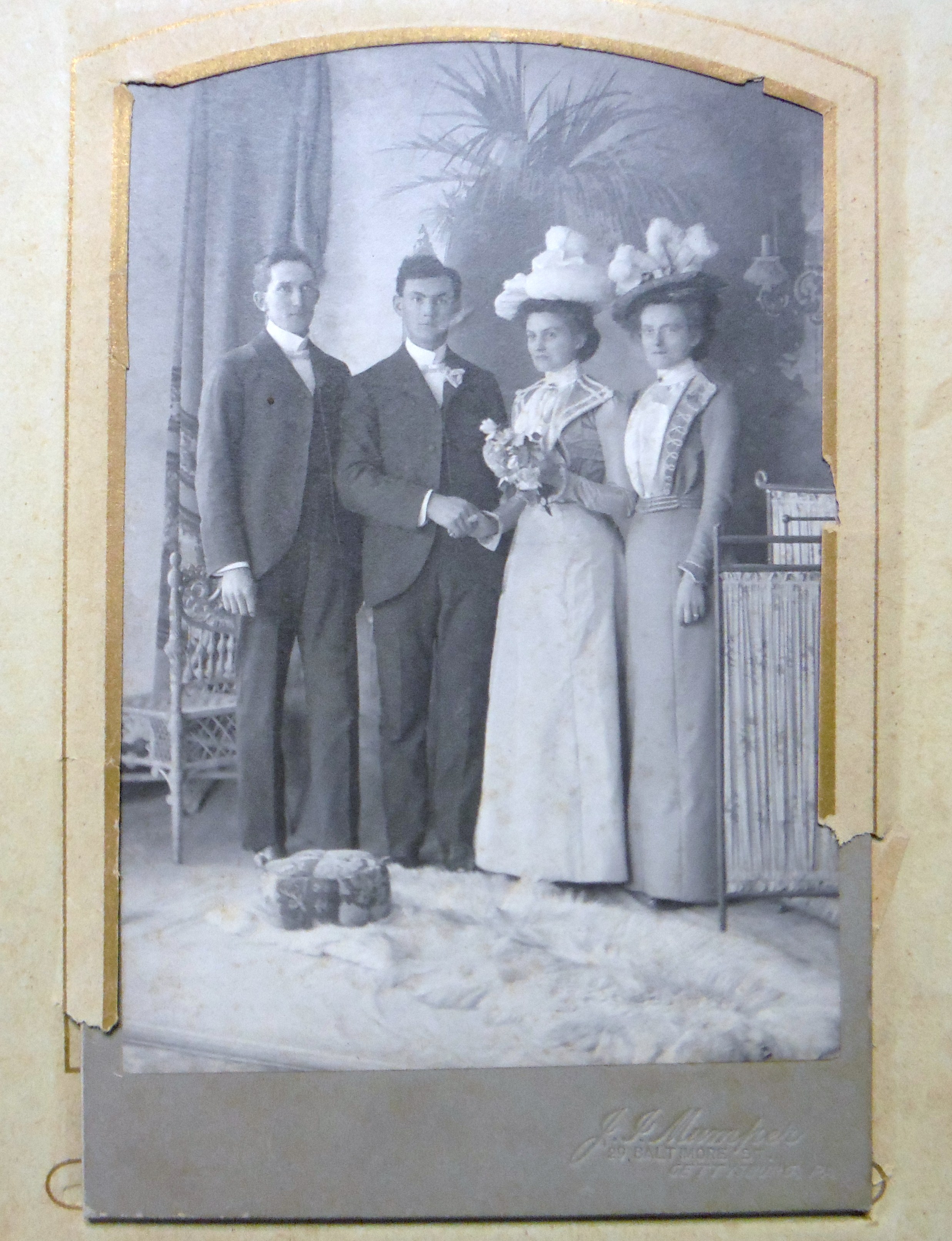 Victorian Era Red velvet photo book with aluminum trim and cutout of the word "Album." This book, which accompanied 2013-62A-1, contains (26) cabinet cards. Based on Timothy Smith's (Adams County Historical Society) analysis of the Gettysburg area photography ptudios, the photos were shot from the 1890's to the very early 20th Century. Most of the photos were taken at J. Mumper and W. H. Tipton studios in Gettysburg, PA. Only one card in the album has a written back mark.