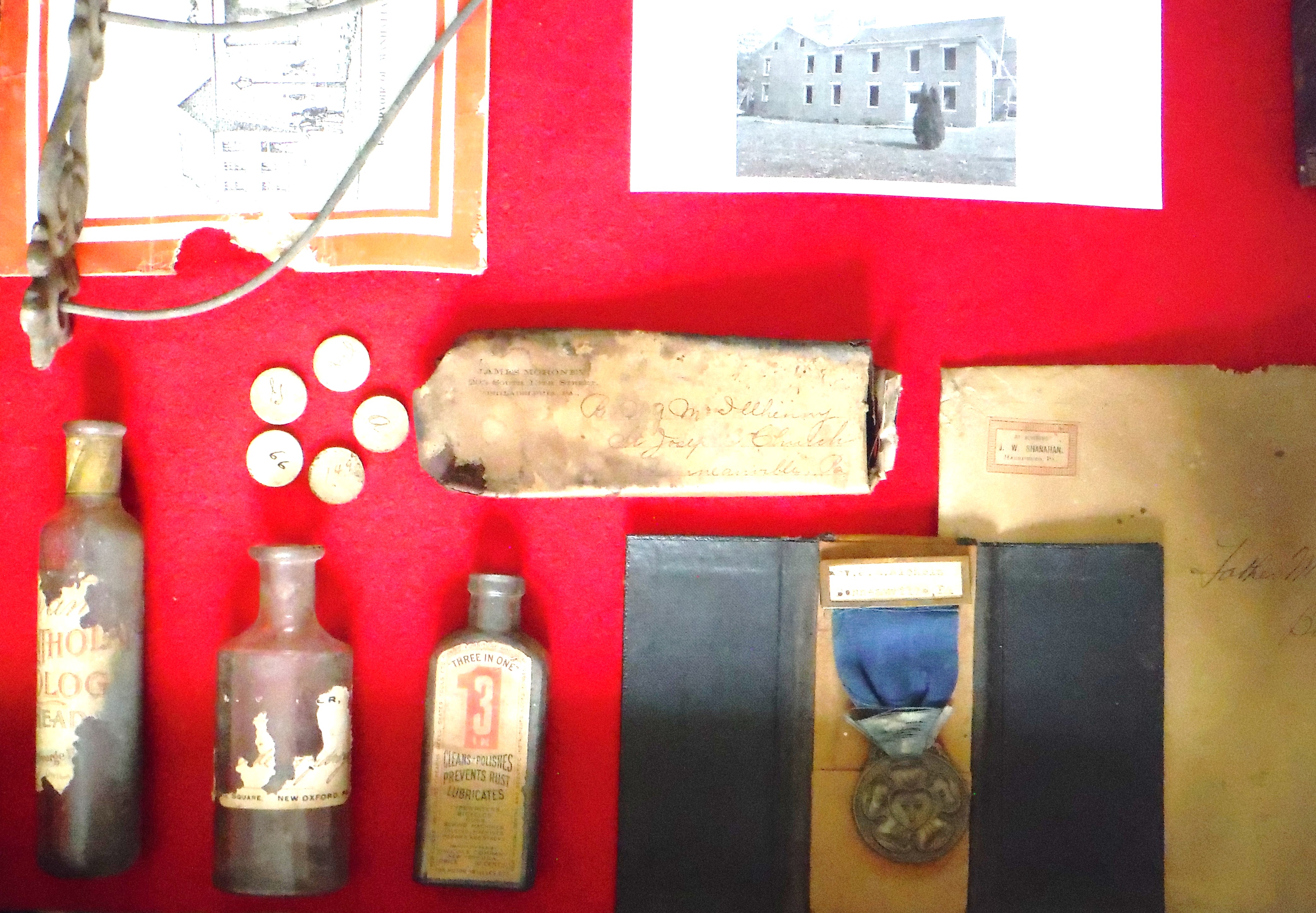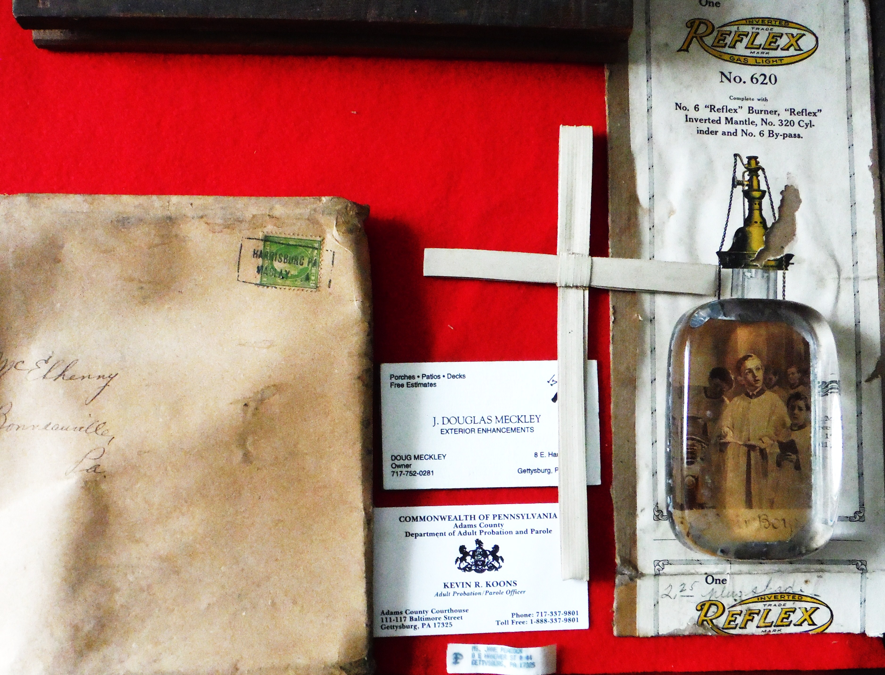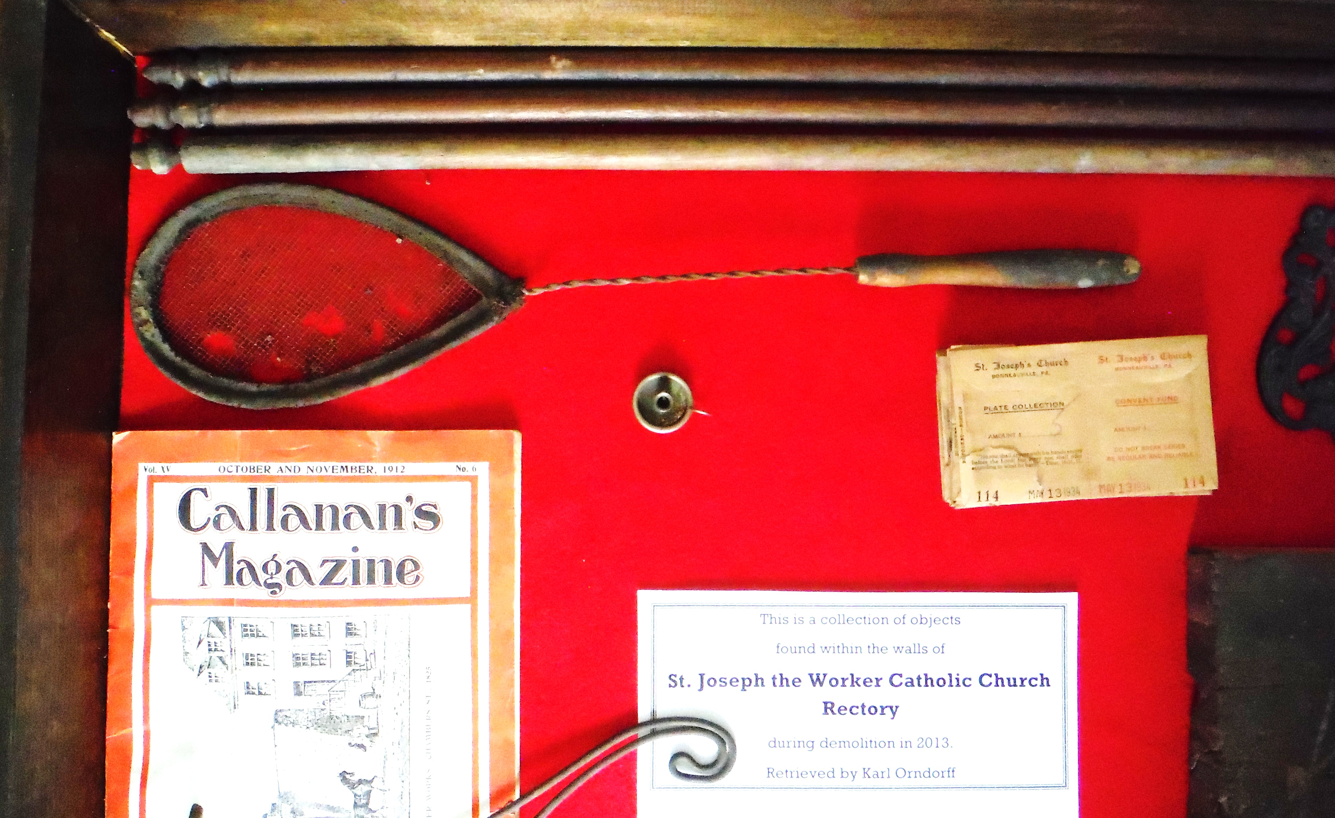 The following items were collected from St. Joseph's Rectory in Bonneauville in the Fall of 2013. It was then that the building was being prepared for dismantling. The old brick structure was constructed in the last half of the 19th Century and had suffered many decades of neglect. The building was partially dismantled for recycling and environmental reasons. In the process, the walls and hollow spaces were carefully scrutinized. Behind stairwells, old chestnut trim, paneling and wainscoting lie bits of history that are here displayed.