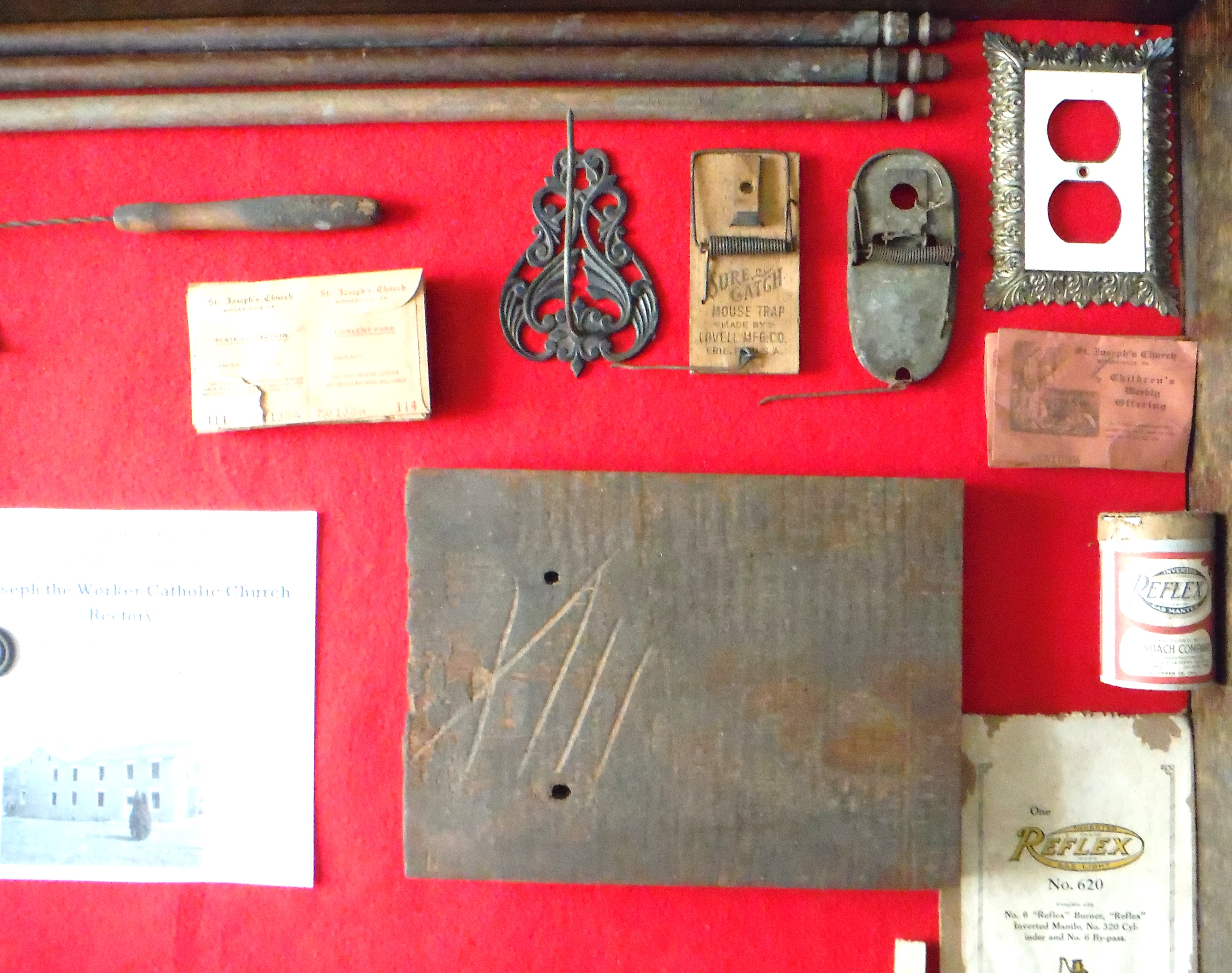 Items that dated back at least as far as 1876 (Rev. McIlhenny's tenure) began to surface. Notable was that some early priests must have disliked house cats. Mice had dragged everything from the traps designed to catch them, to collection envelopes (empty) and correspondence, inside the walls and stairwells.