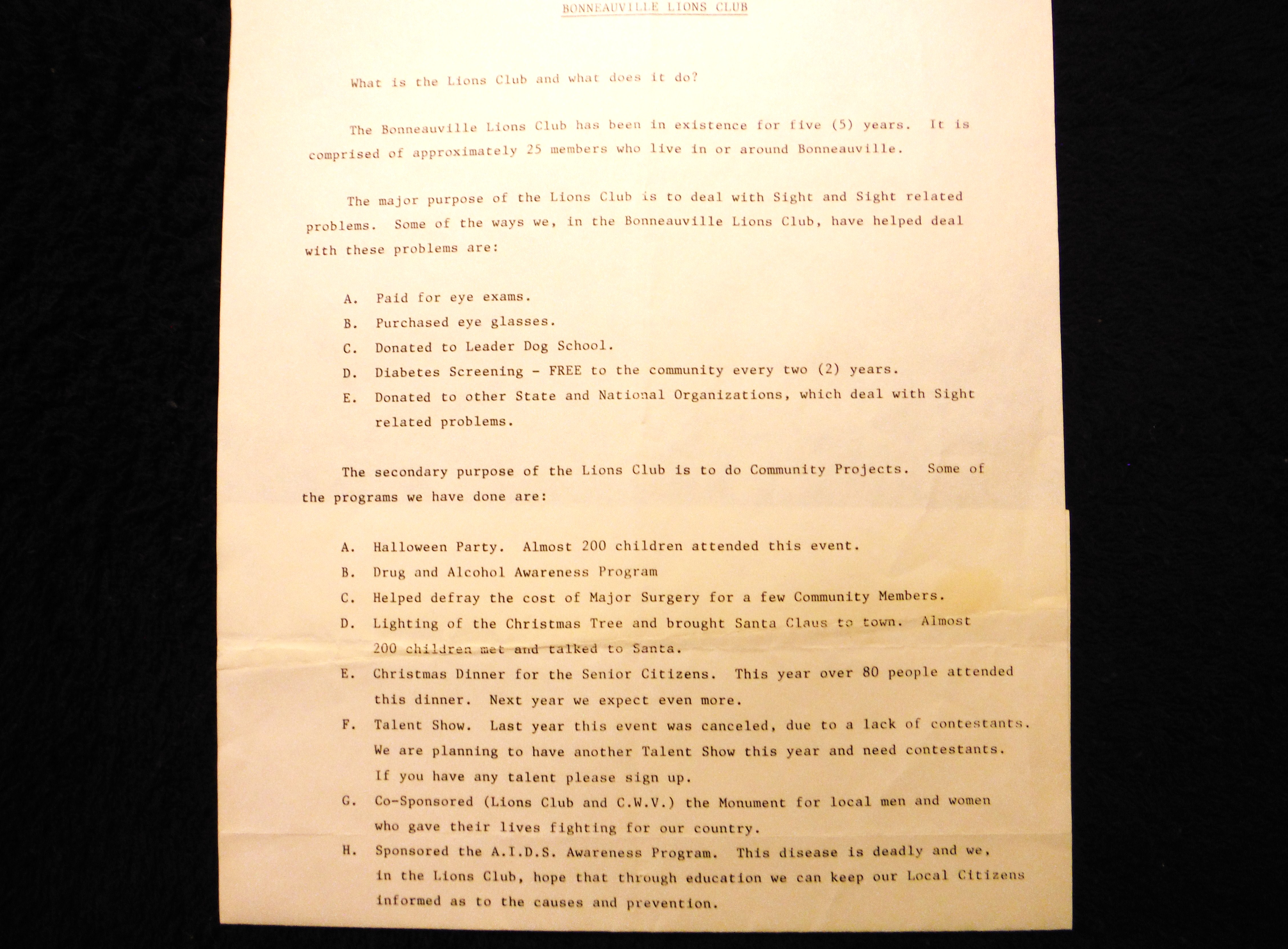A list of accomplishments to date, community goals, and services of the Bonneauville Lions Club. President; Robert Dempsey.