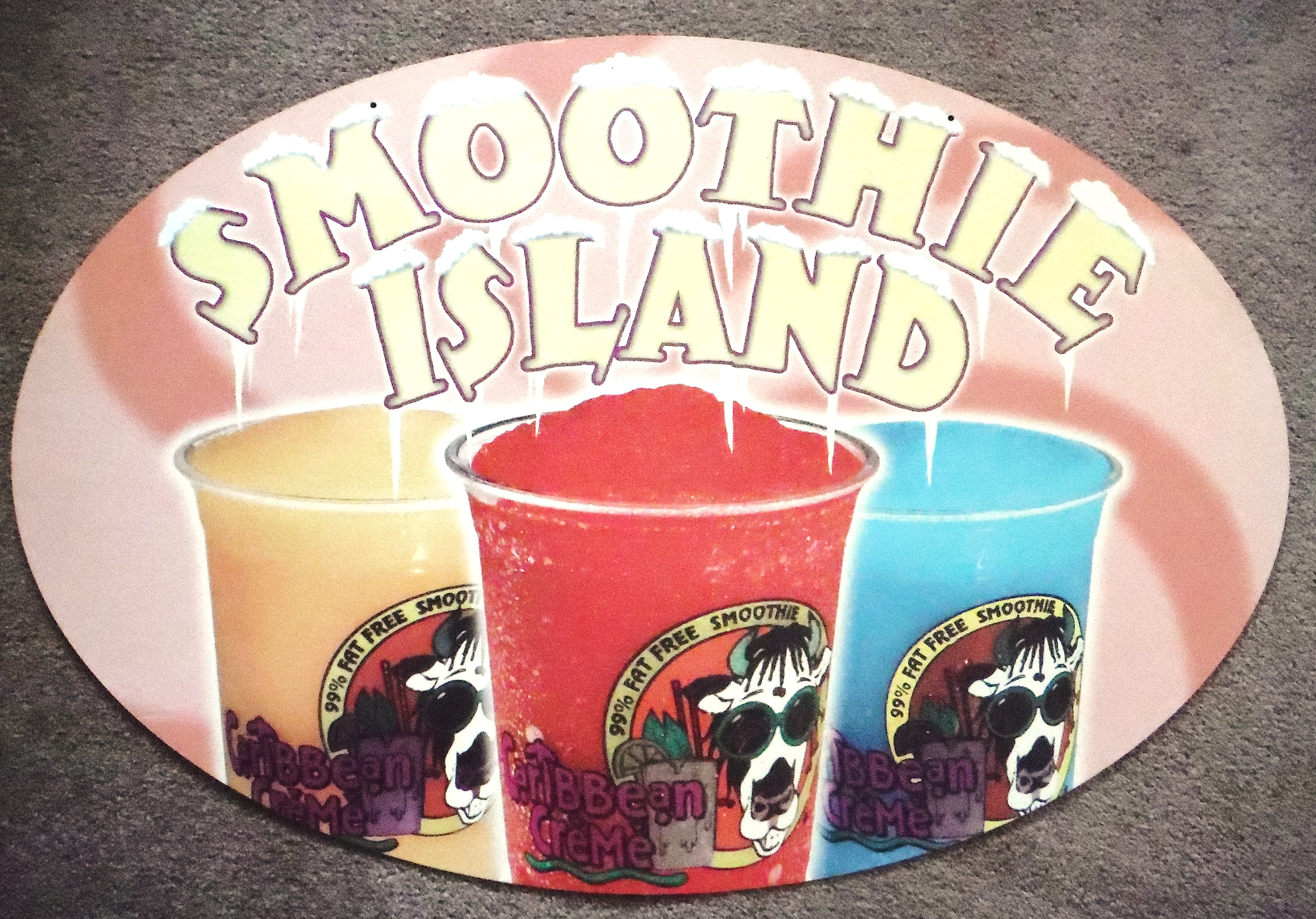 "Caribbean Cream," "99% fat free smoothie." Oval, corrugated plastic, 36" wide.