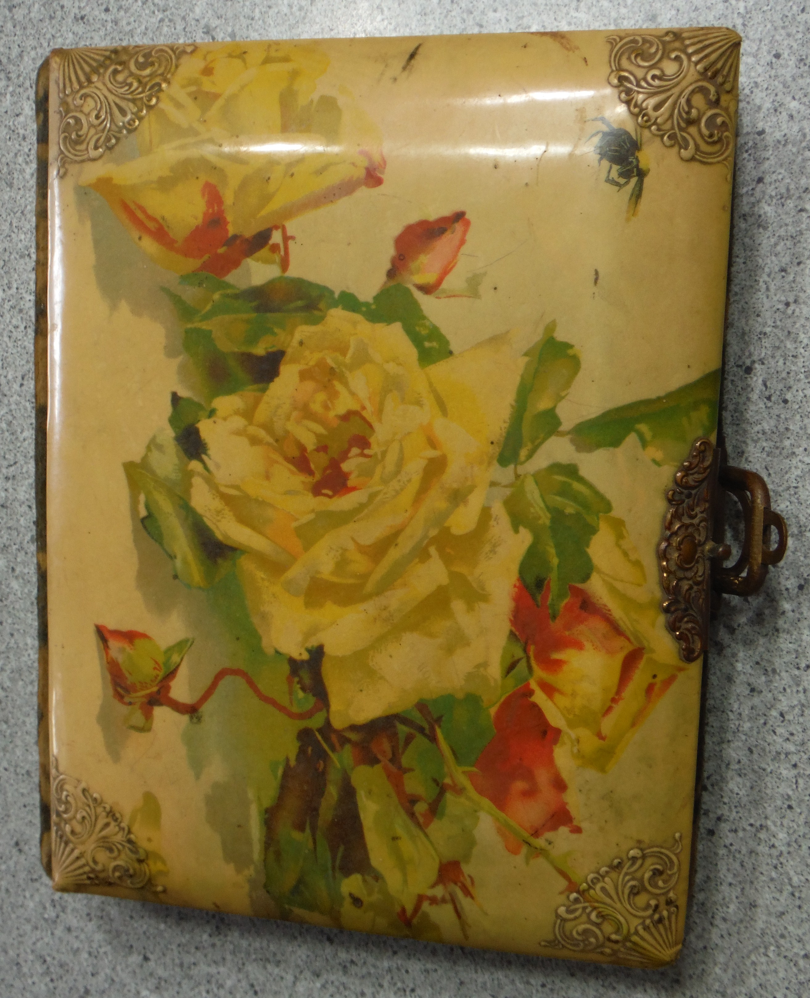 This photo album is No. One (of two) that were recovered from the George and Esther Eck Kuhn/Marie Kuhn/Mary Ester Kuhn estate. The three generations of Kuhns and their ancestors lived just north of Bonneauville, PA. Both albums were stored in the long unvisited attic of their home. Keeping family photo albums was tremendously in vogue in the late 1800's and early 1900's. The greatest competition existed between designers for the finest albums. Patents for mountings, latches, inserts, and covers abound. The latest new-age luxury materials were used. This album No. 1 sports a celluloid plastic, rose themed cover, with ornate brass corner protectors. The spline and back cover are of yellow and green sculpted velvet; also rose themed.