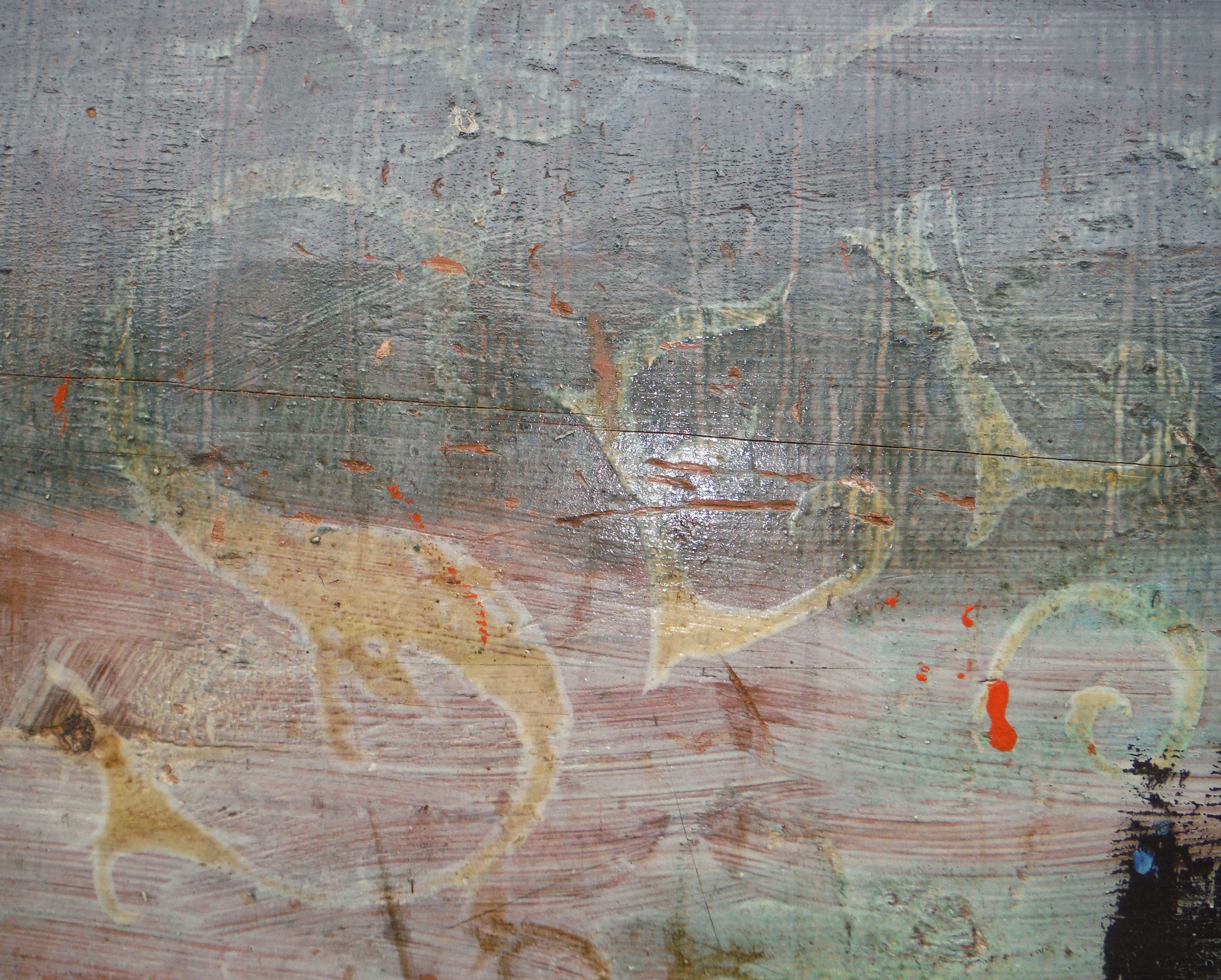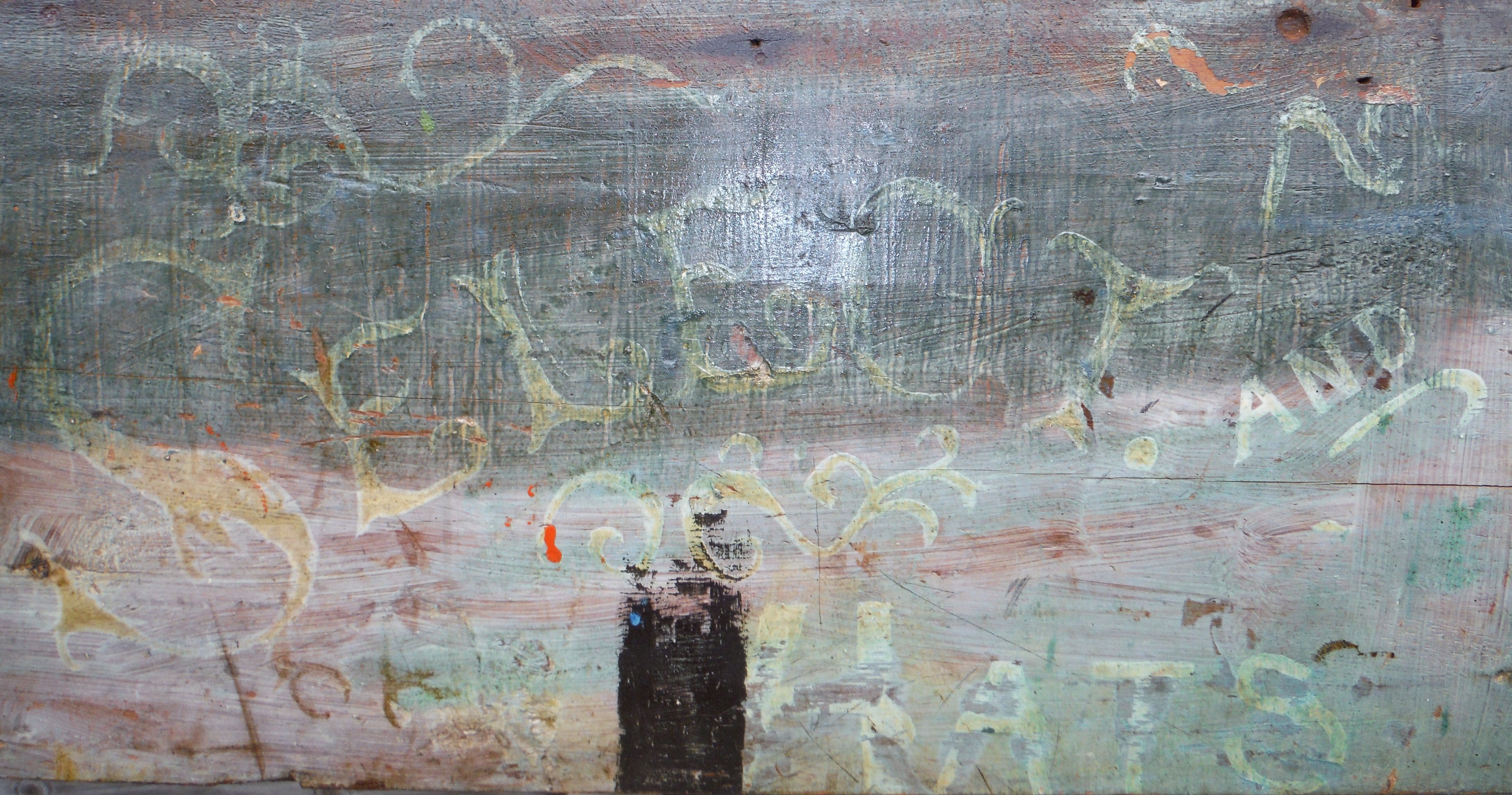 This 15 ½" x 32" x 1" thick wooden sign appears to have its origins in the 19th Century. The paint is faded and the text difficult to read. The words "Select and hats" gives the appearance that the board had been cut from a larger wood sign and repurposed. About five inches of unpainted, nail-hole riddled wood has been trimmed from each end. The rough ends and the black swath of paint at bottom, center, are further evidence that the piece served another purpose after its life as an advertisement. The piece was recovered from the Kuhn's attic.