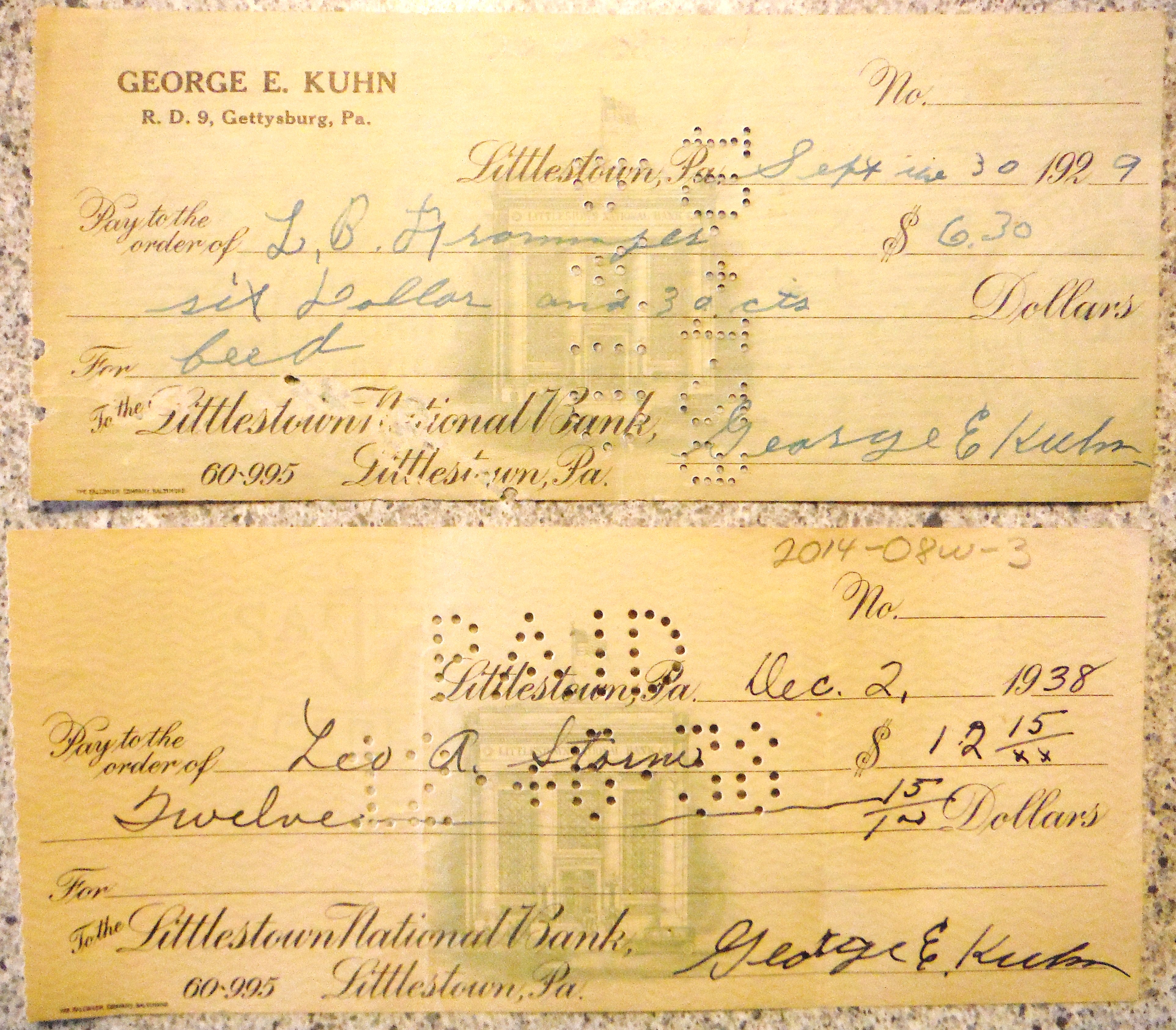 2014-08W-4, Cancelled check; Leo A. Storm operated one of several stores and feed mills that sold animal foods in the Bonneauville area during the 20th Century. This cancelled check represents George E. Kuhn's expenditure of $12.15 at Storm's Store on Dec.2, 1938. The store was located at what is currently an abandoned restaurant at 16 E. Hanover Street in Bonneauville, PA.