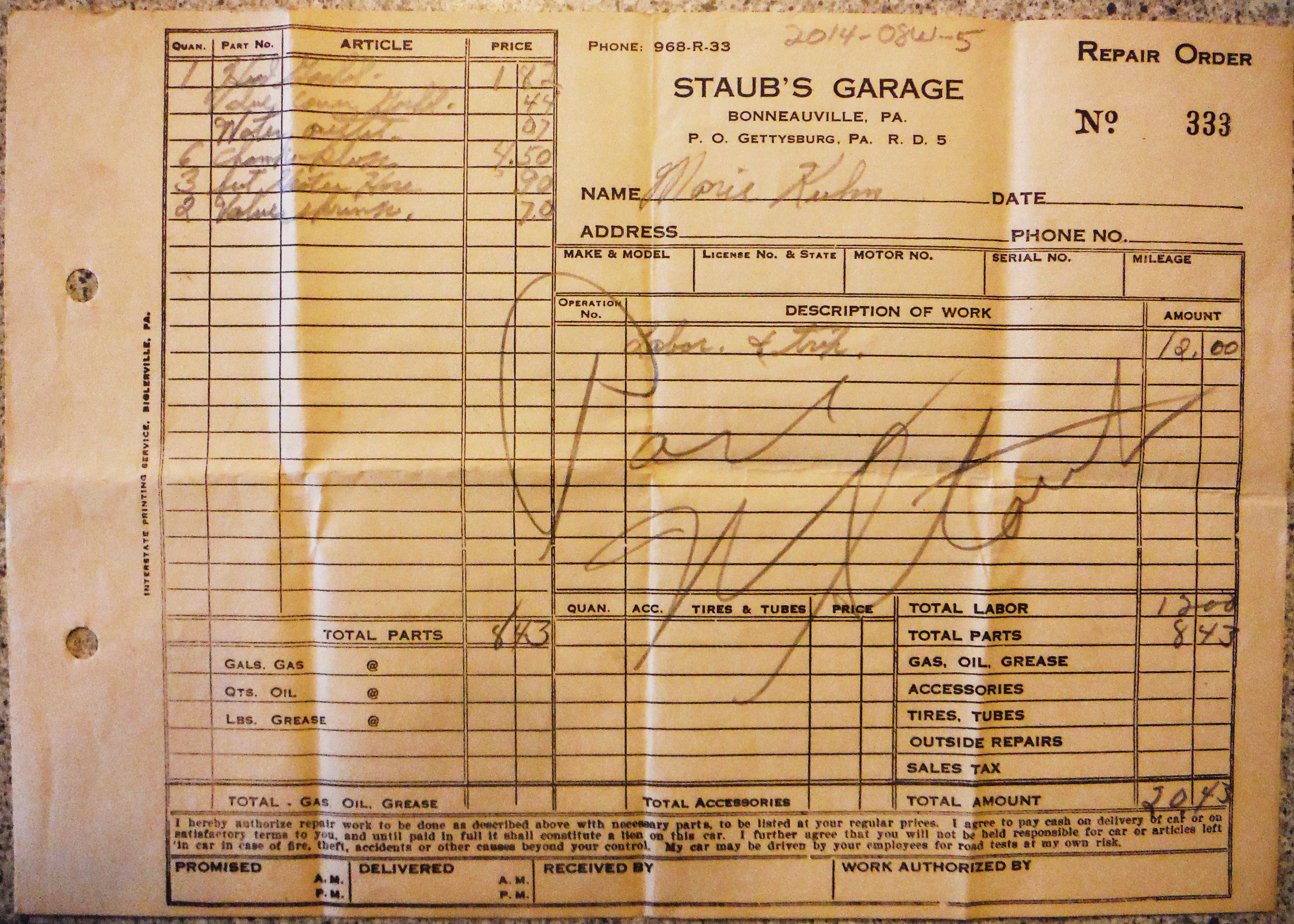 2014-08W-5, Receipt; Staub's Garage, Gettysburg, PA R.D. #5. The repair order to Marie Kuhn is signed; "Paid, W. Staub." There is no date indicated but the paper probably dates to the early 1950's. The phone No. 968-R-33 gives some indication to the age of the piece as does the parts list. A head gasket cost $1.82, a water outlet, seven cents. The total cost with labor was $20.43. A current head gasket job (6/15/14) can easily run $1500.00.