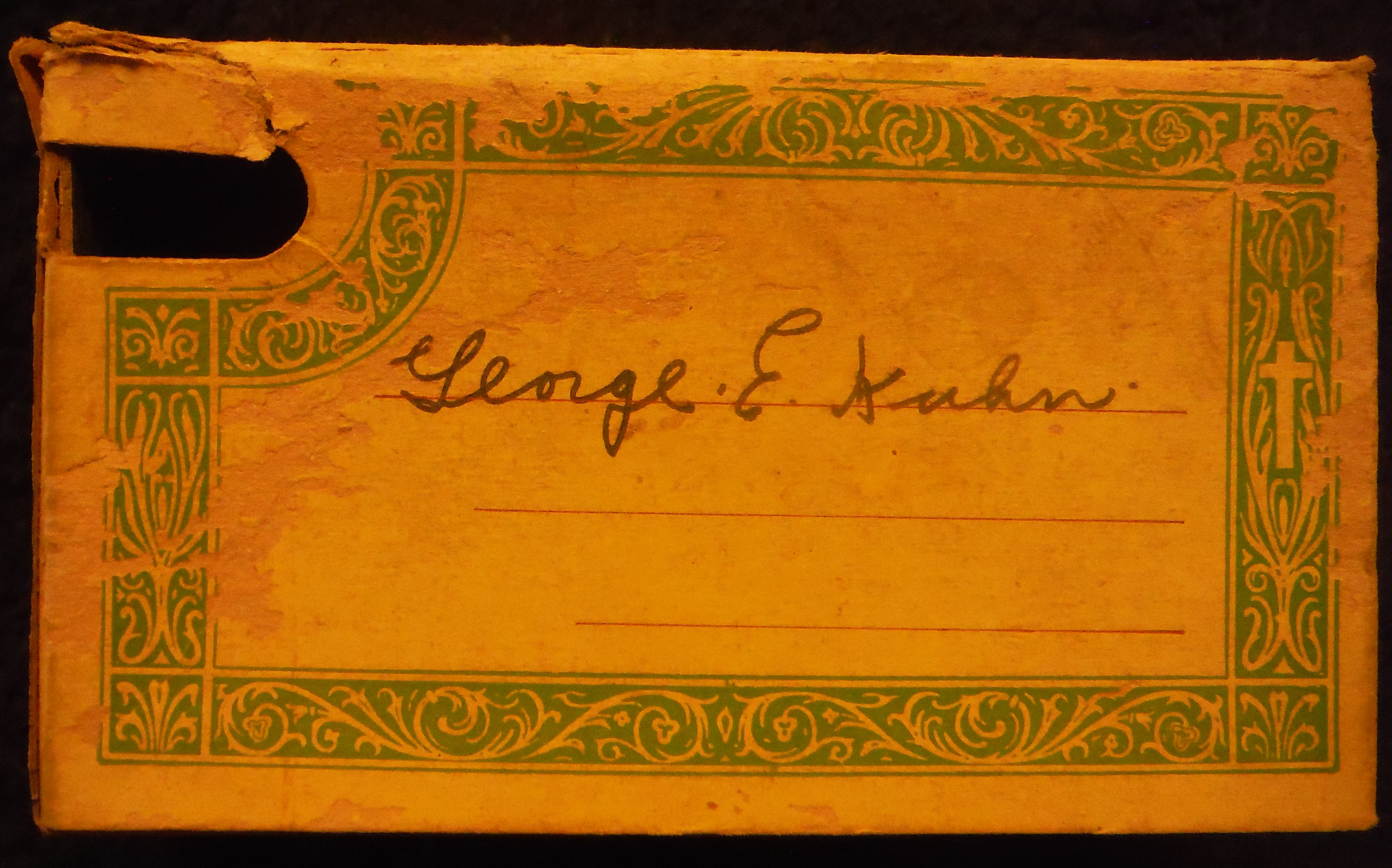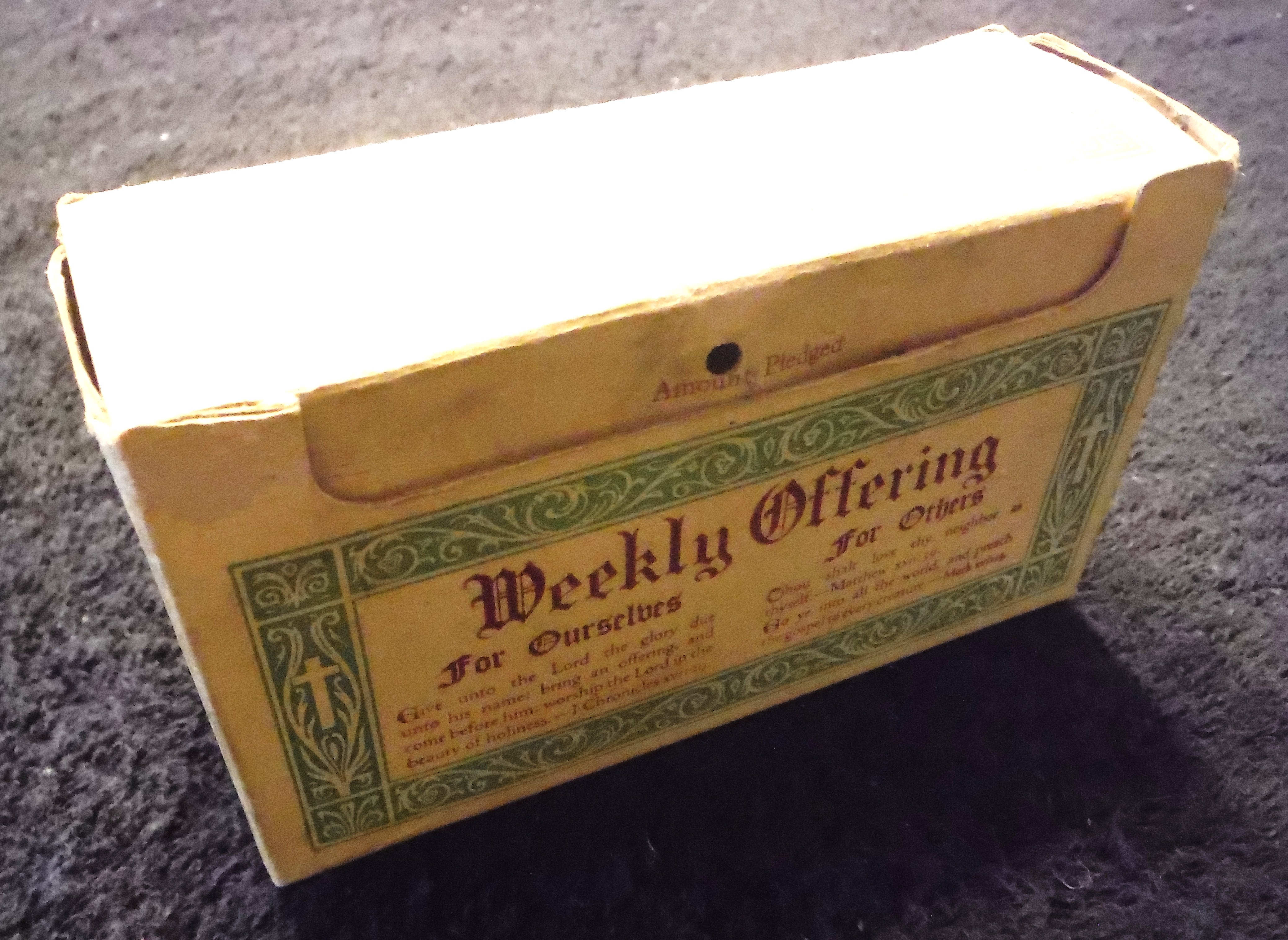 Mid-20th Century box which once contained donor coded, weekly offering envelopes. Mid 20th Century, signed George E. Kuhn.