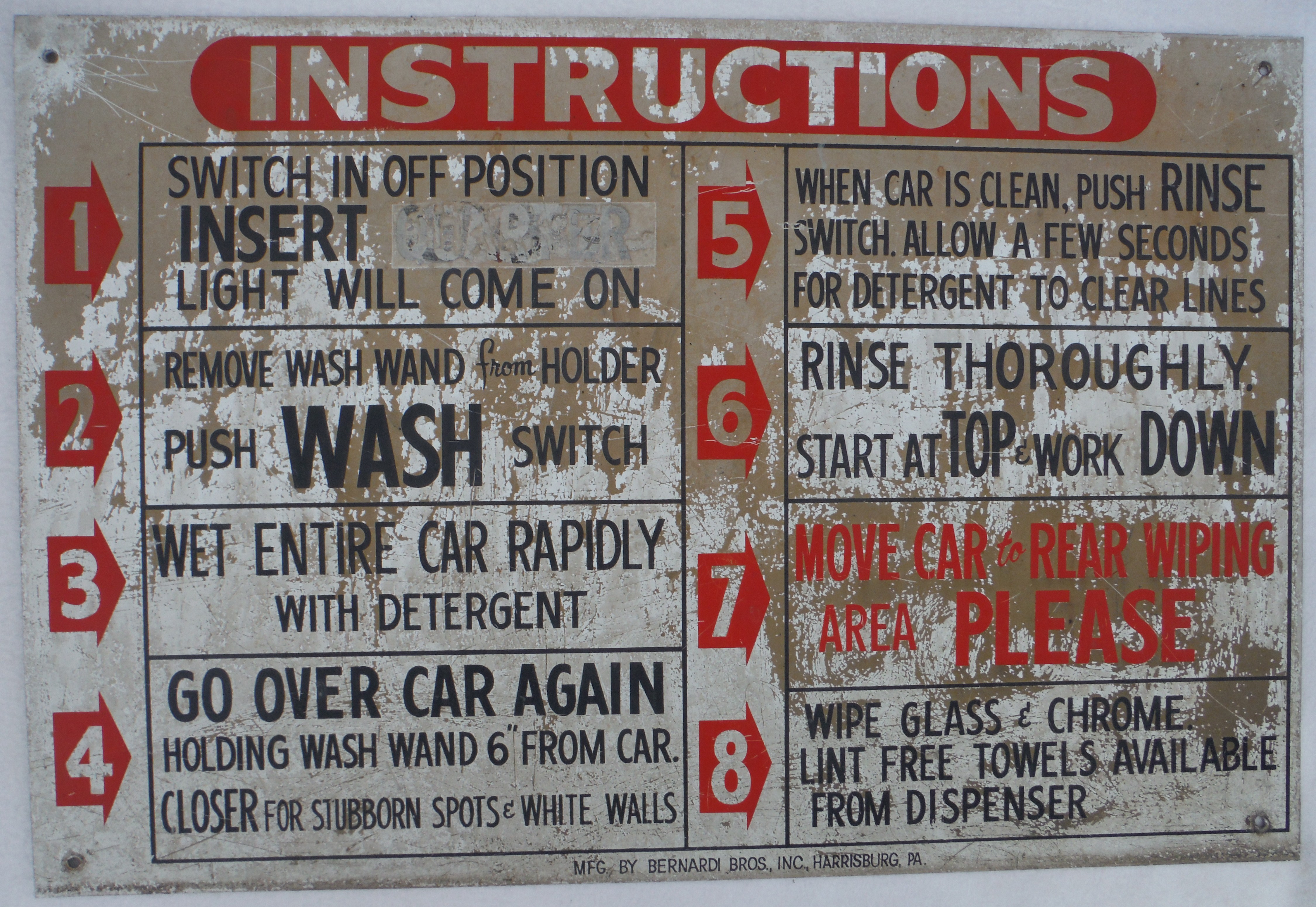 Metal sign listing eight rules for the proper use of equipment at Anthony "Tony" Martin's Bonneauville Car Wash in Bonneauville, PA.