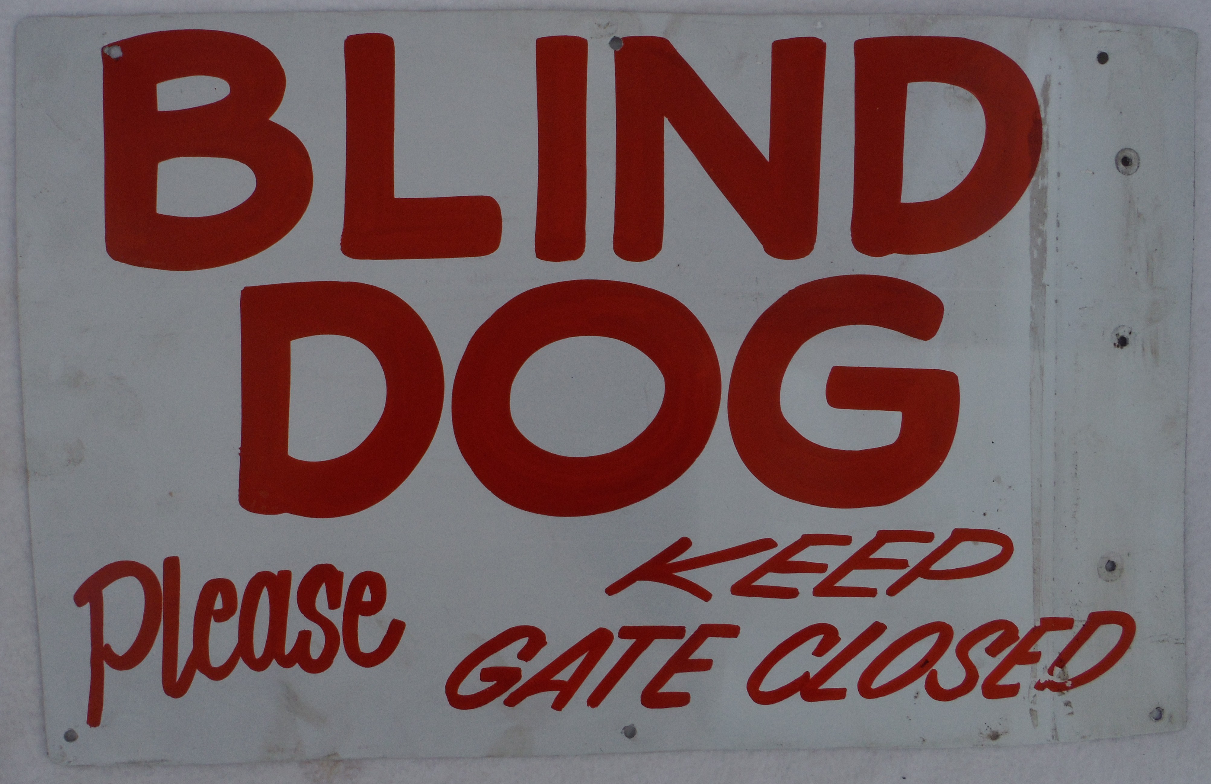 Metal sign from Martin's Bonneauville Car Wash, Bonneauville, PA. "Blind Dog, please keep gate closed."