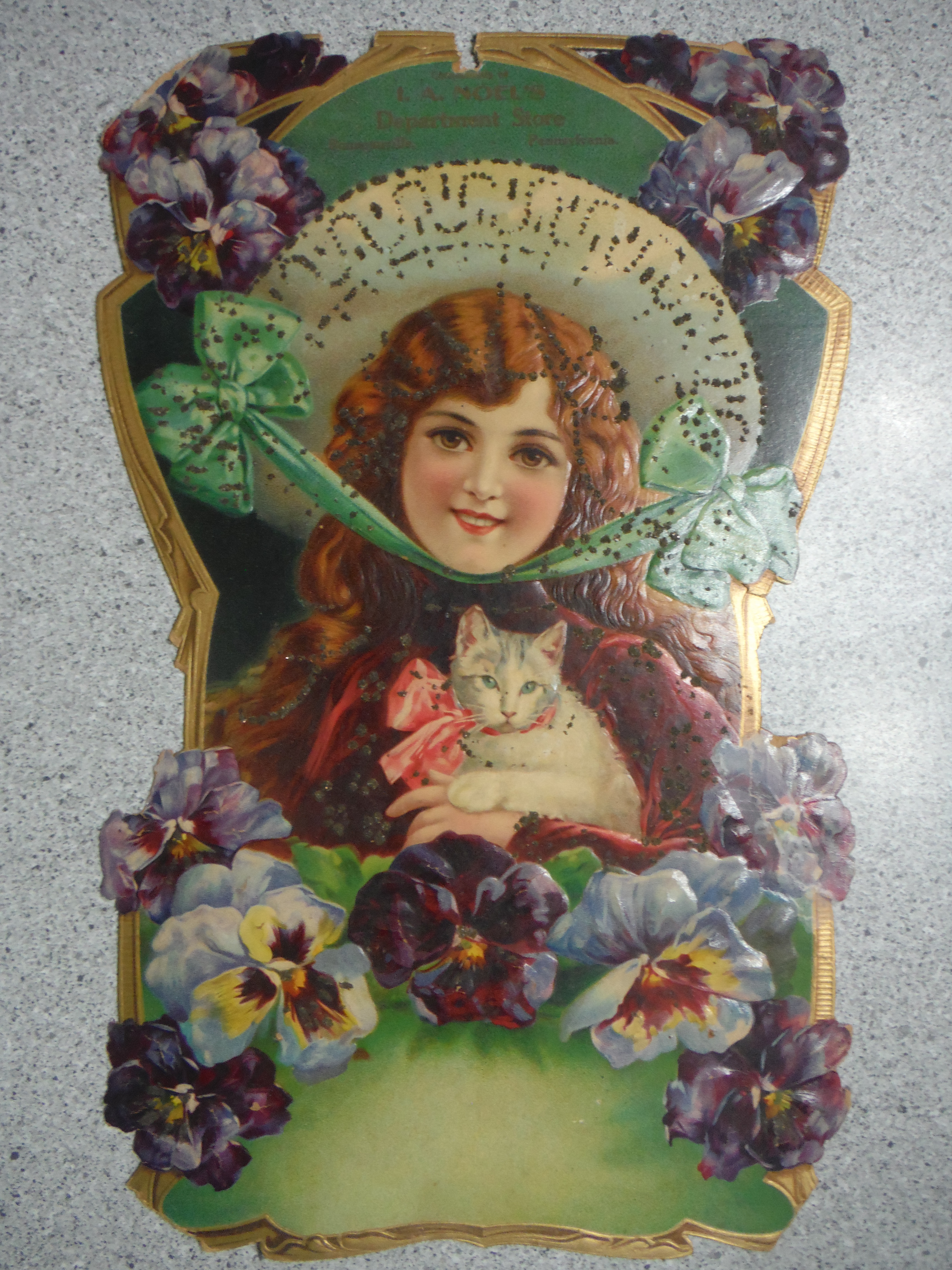 This calendar represents the finest quality that could be had at the time. Mr. Noel spared no expense on his gratuities. The lithographic color is excellent well over a century after the piece was produced. The calendar is embossed. The subject; a beautiful young girl, her wardrobe, a kitten and a profusion of flowers is exquisite. Gold glitter (now a bit discolored) further enhanced the piece.