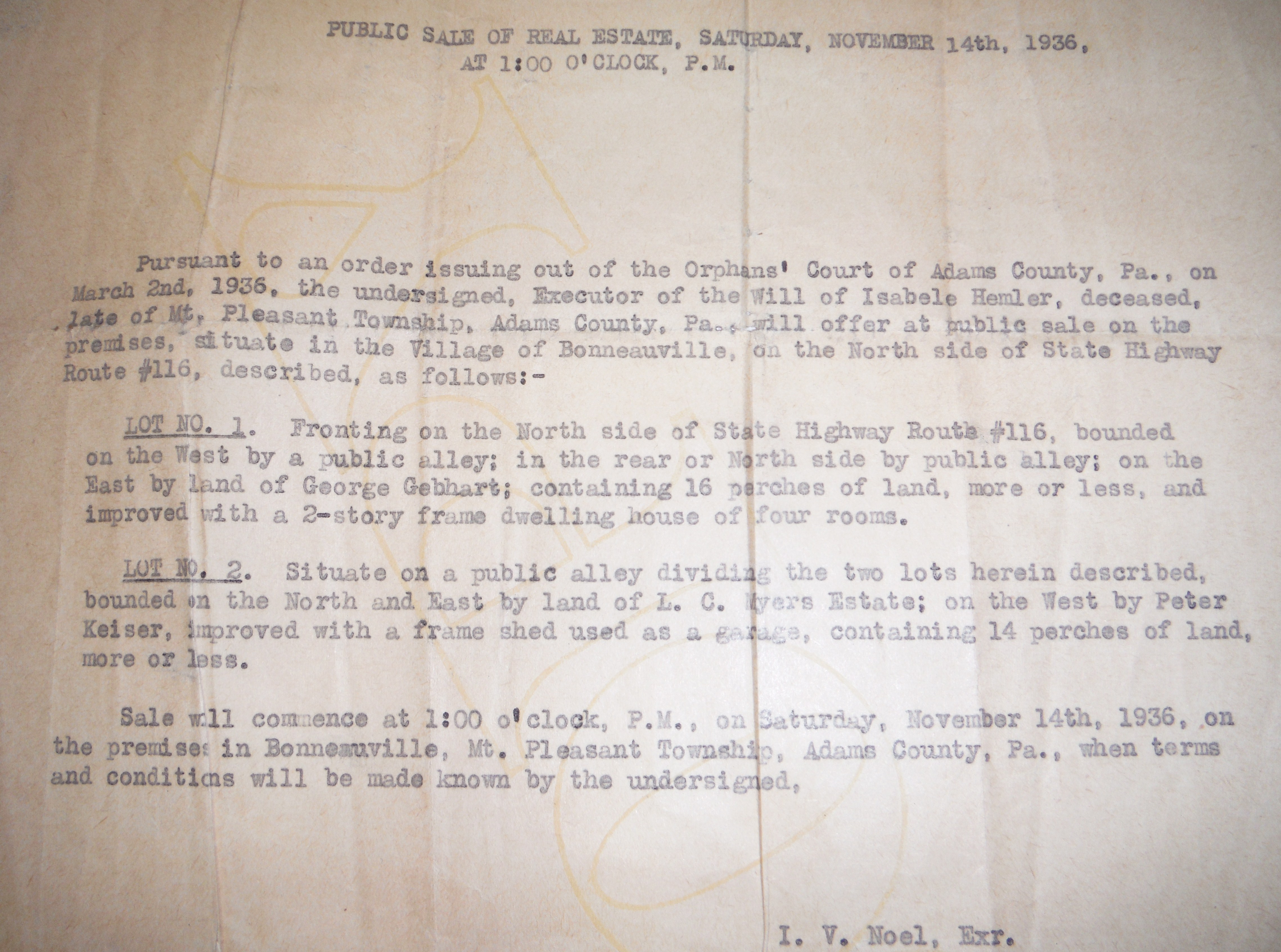 Public Sale of real estate for the property of Isabele Hemler, Bonneauville, PA. November 14, 1936. (Current address of the primary property is; 1E Hanover St., Bonneauville, Gettysburg, PA. 17325.) Executor; I. V. Noel. Up for auction were two developed properties in close proximity. Lot one was bordered by the highway in front, an alleyway on the west side and in the rear, and the George Gebhart home to the east. Lot two was bordered by a public alley, the property of L. C. Myers, and the home of Peter Keiser.