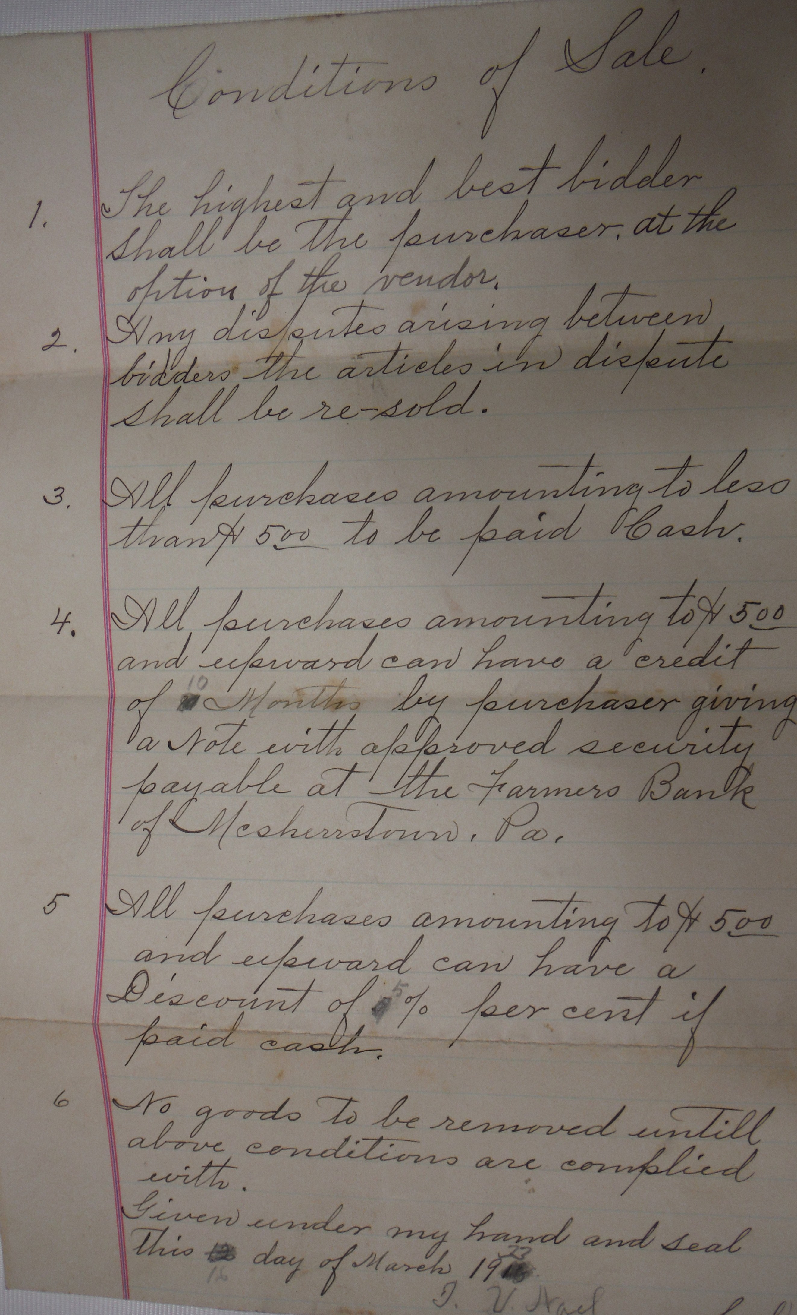 Purchases under $5.00 - cash only. $5.00 and over - credit will be extended. Terms are virtually identical to those announced at the beginning of a typical public sale in 2015.