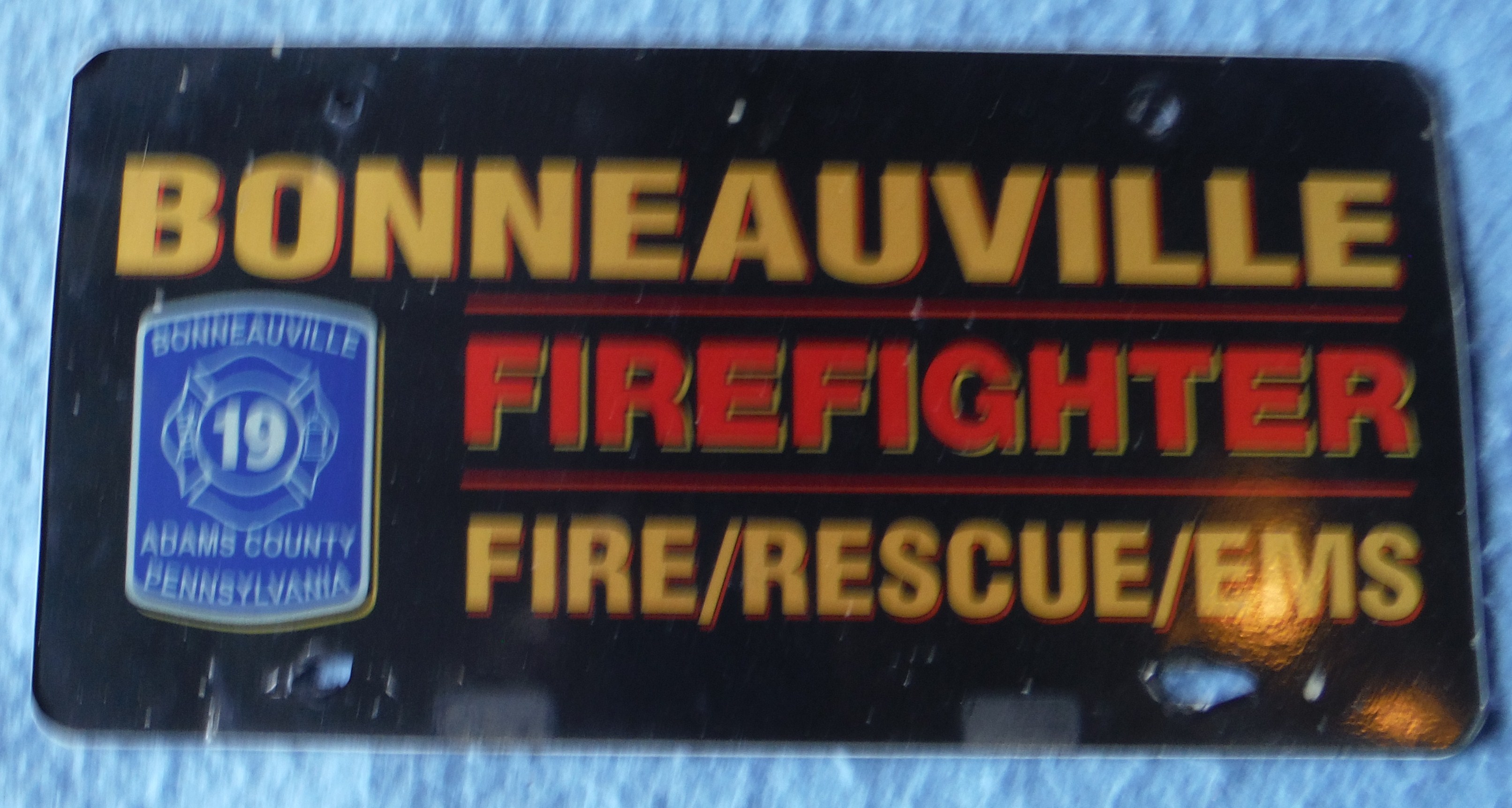Red and yellow on black vehicle liscense plate. "Bonneauville Firefighter, Fire/Rescue/EMS", with blue Co. 19 Logo.