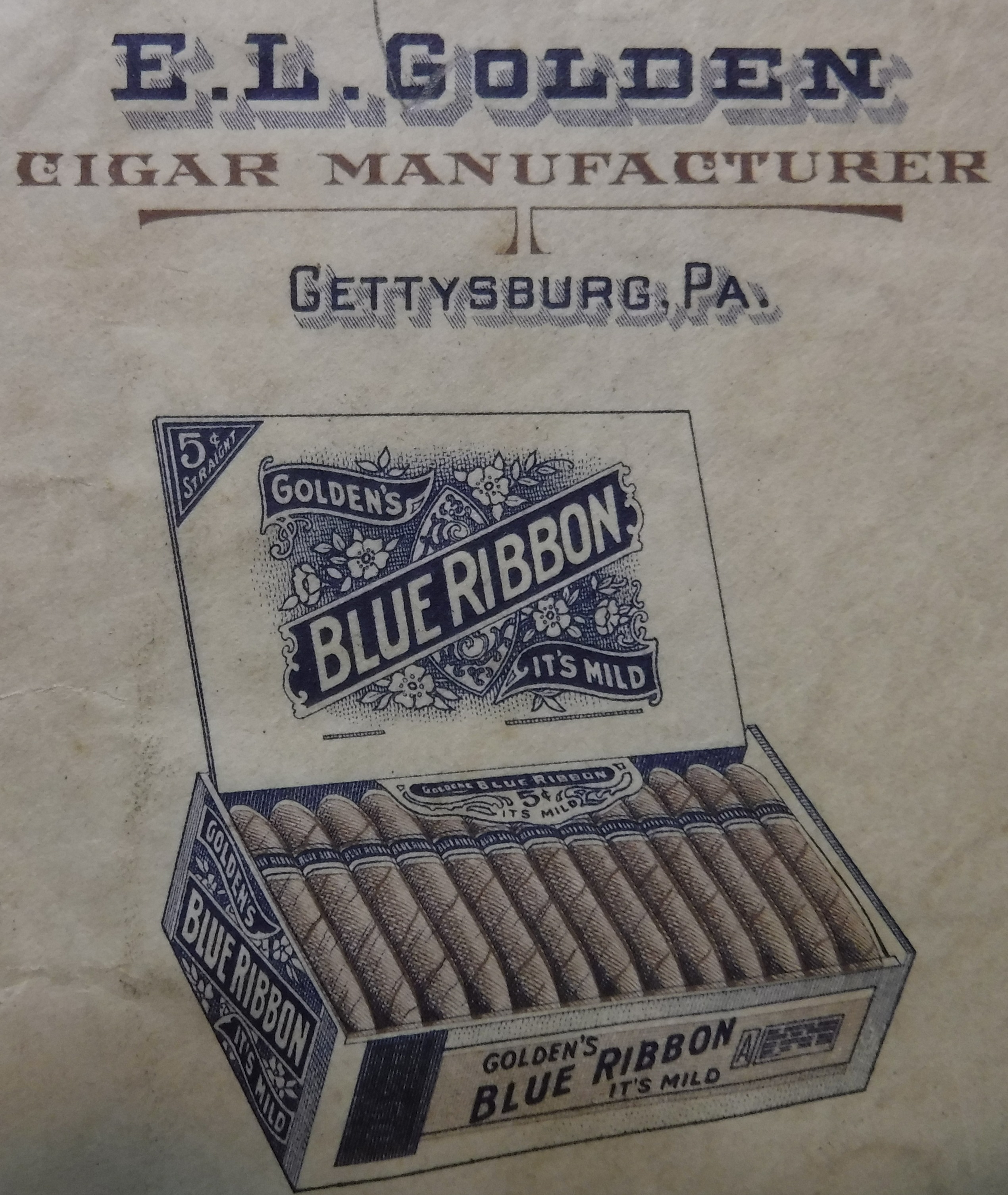 Revealed here is a business envelope from E. L. Golden, cigar manufacturer, Gettysburg Pa. E. L. Golden's cigar factory was located in Bonneauville, PA, a rural delivery town of Gettysburg, PA Post Office. Blue and white were the favored colors for advertising of the Blue Ribbon brand of cigars. Blue and light brown were the only colors needed for the printer to produce the attractive text and logo. Text on the box includes: "5c, Golden's Blue Ribbon, It's Mild." Readable on each tiny cigar band are the words "Blue Ribbon."