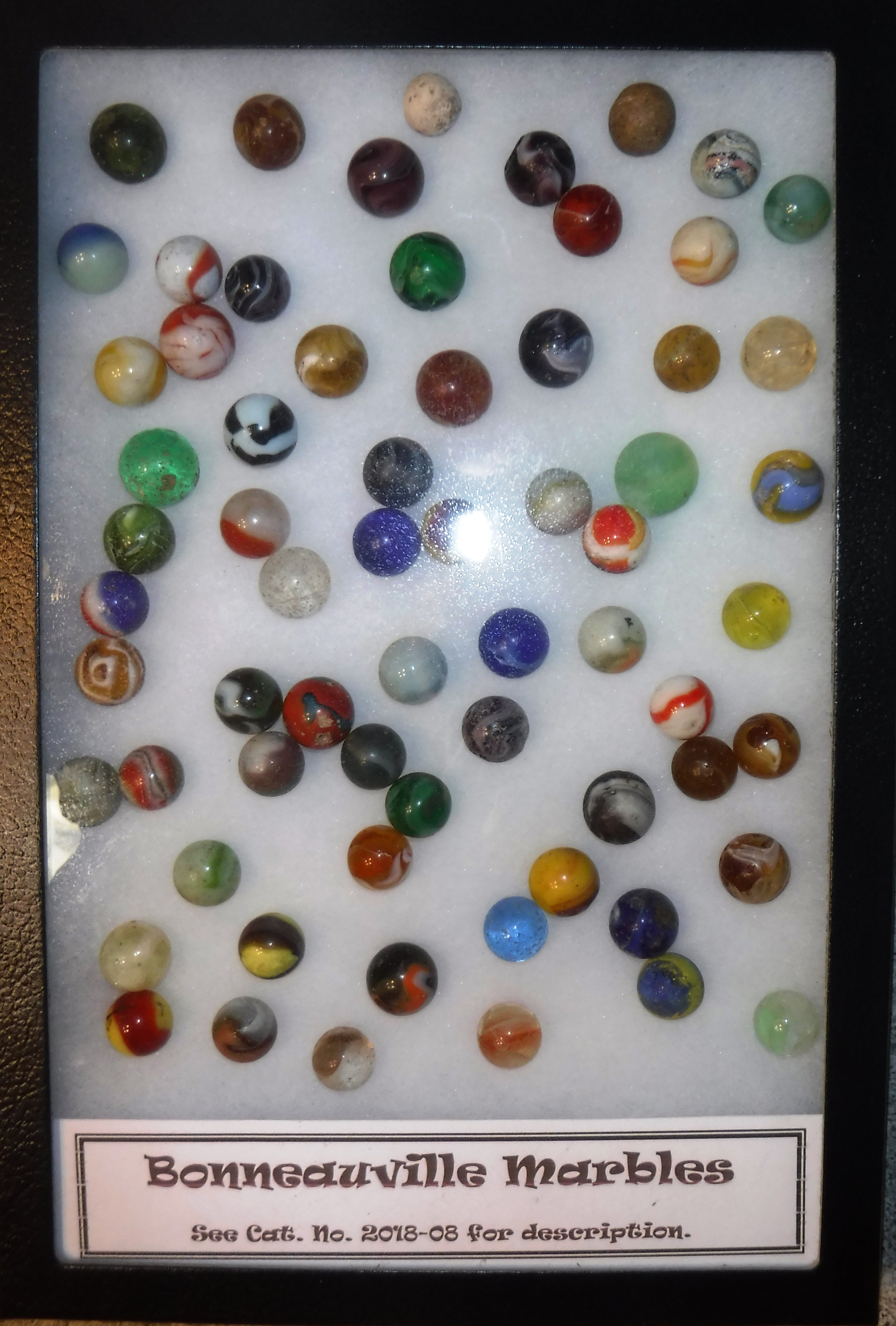At the lower right hand corner of this display are four small ceramic tiles. They were found with the marbles in Mr. Myers farm field. What ceramic tiles were doing hanging out below ground in a farm field with marbles seems a bit curious.