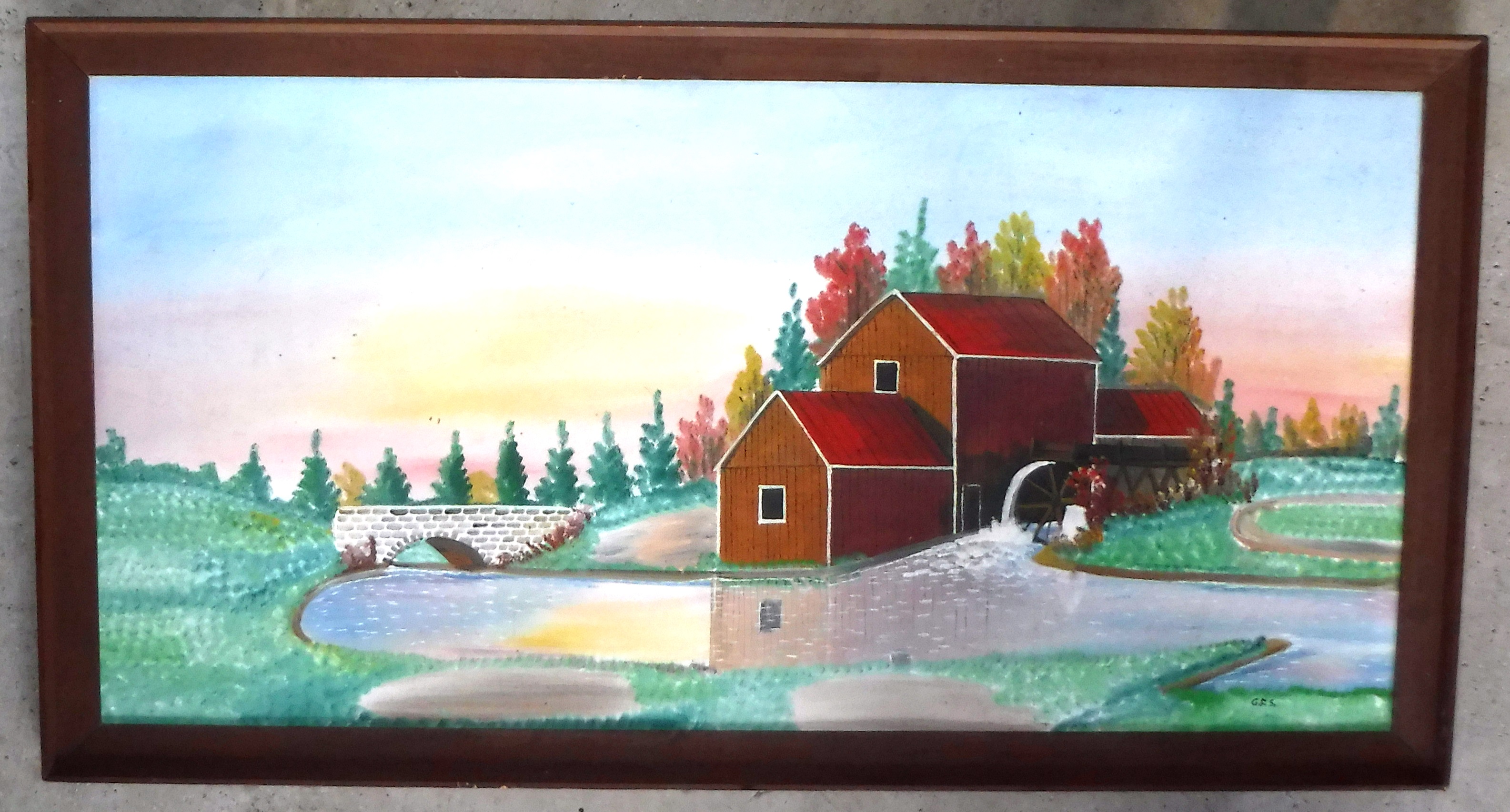Idyllic Old Mill Scene. Water powered mill at sunset in winter.