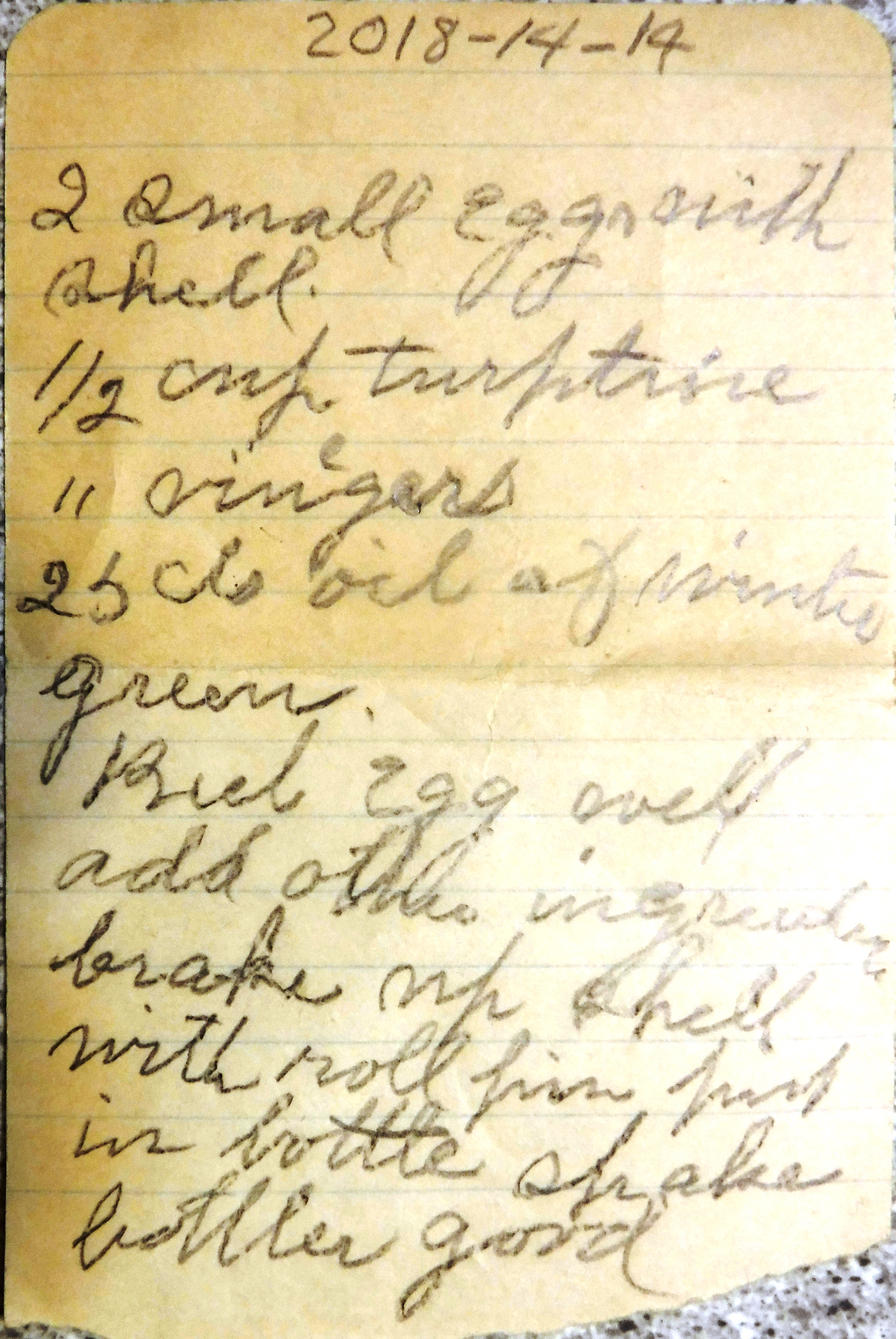 4. Rheumatism, Three Simple Ingredient Liniment for. . . “One pint pure cider vinegar, one pint of turpentine, four fresh eggs, put the egg shells and all in the vinegar, let stand until the vinegar eats the eggs all up, then add the turpentine. This makes a fine liniment."