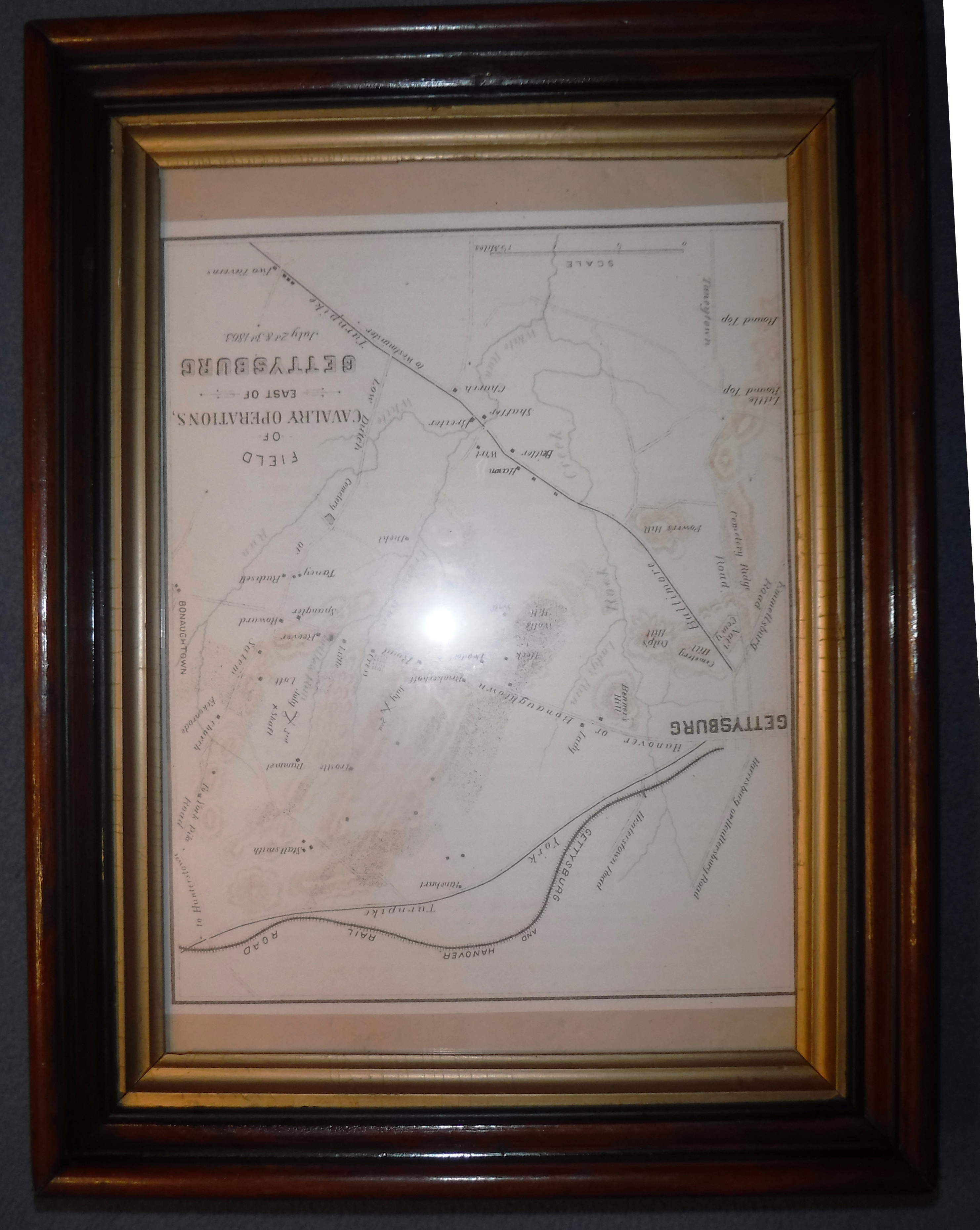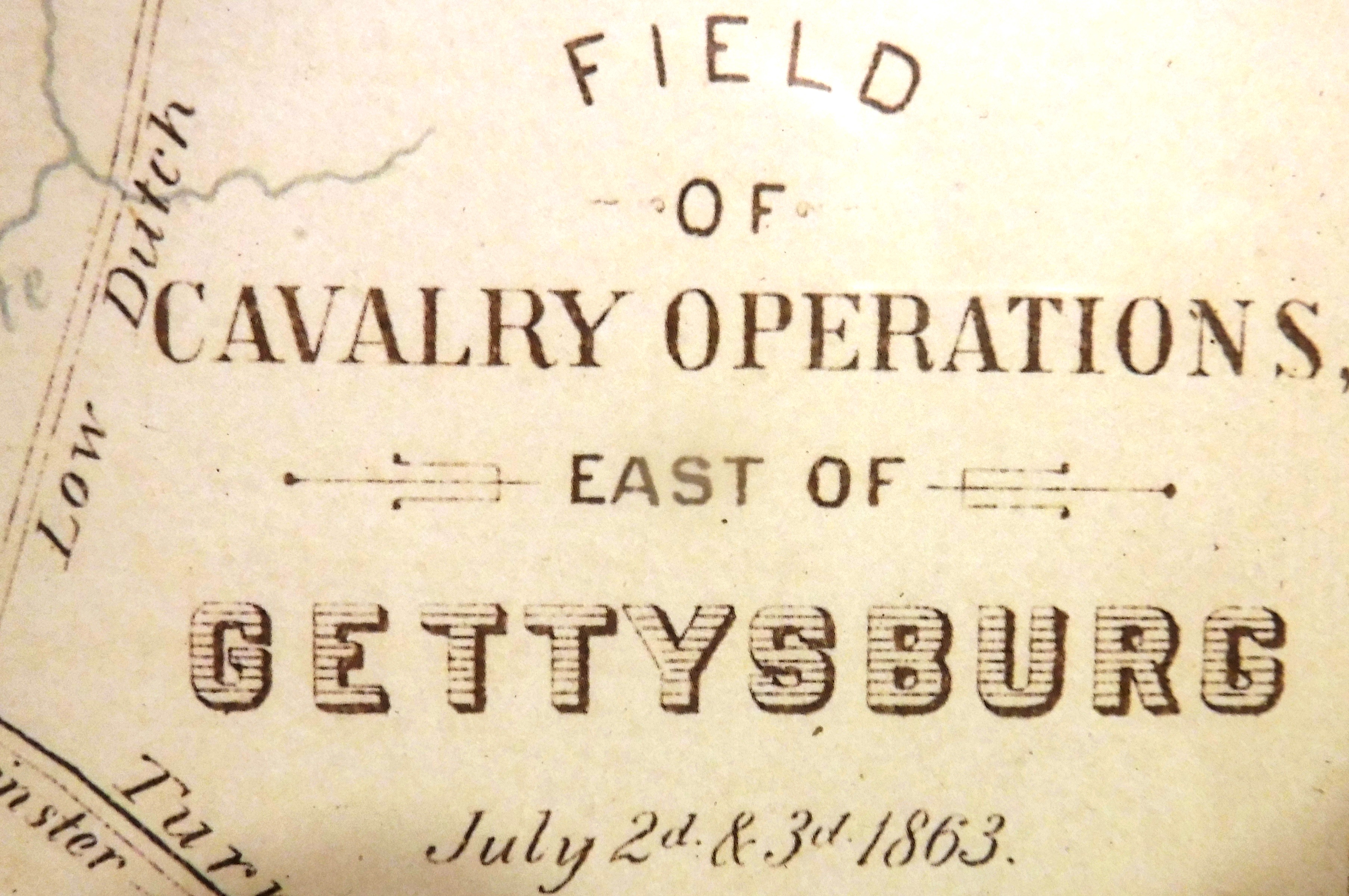 This map spans the area from Gettysburg to Bonaughtown during July 2nd and 3rd, 1863. The road between the two towns is labeled; "Hanover or Bonaughtown Road". The topographical layout gives a good perspective of how close to the town of Bonnneauville the Battle of Gettysburg, and especially the BAttle of East Cavalrt Field, had come. The map also depicts the gentle lay of the land between the two towns.