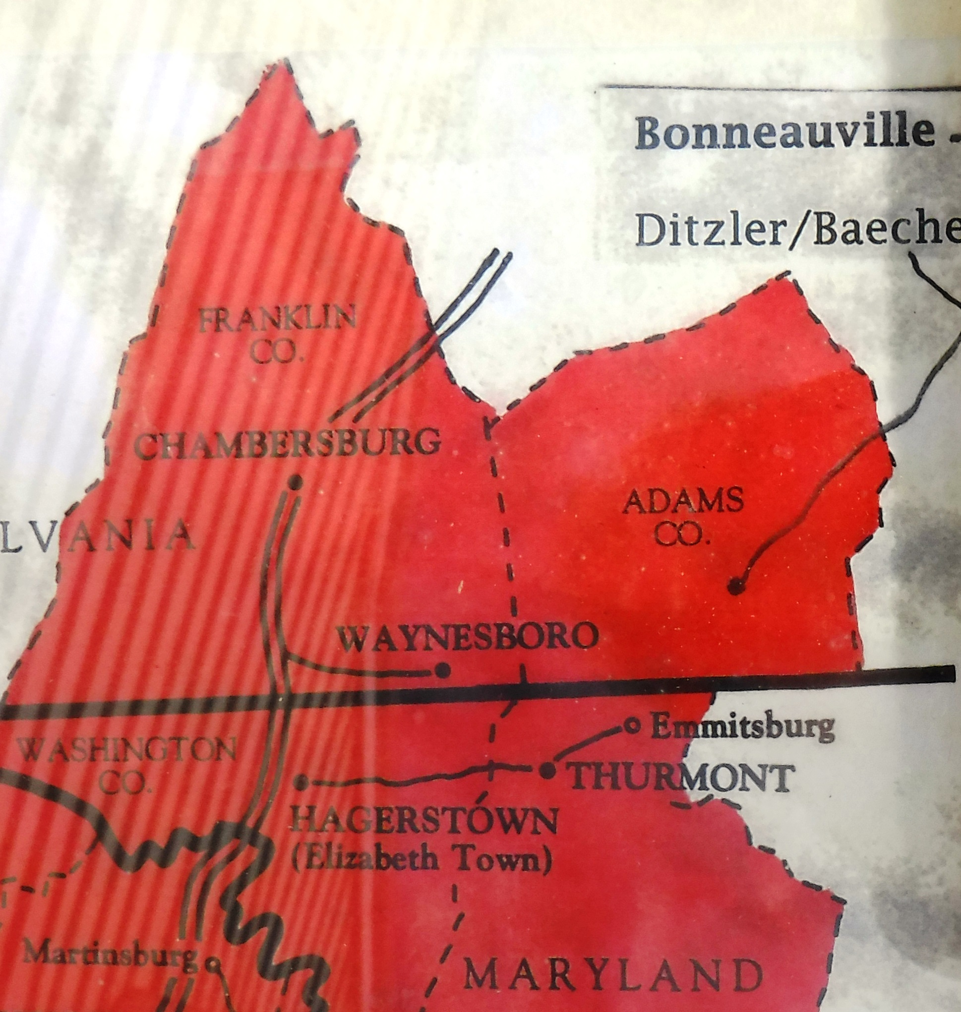 In his book; “Folk Pottery of the Shenandoah Valley” (E. P. Dutton Co., 1975), author William E. Wiltshire III provides a map of the “Shenandoah Pottery Region”. The area includes parts Virginia, Maryland, and Pennsylvania. Wiltshire includes Adams County, PA in his map. Ditzler/Baecher kiln location has since been added.