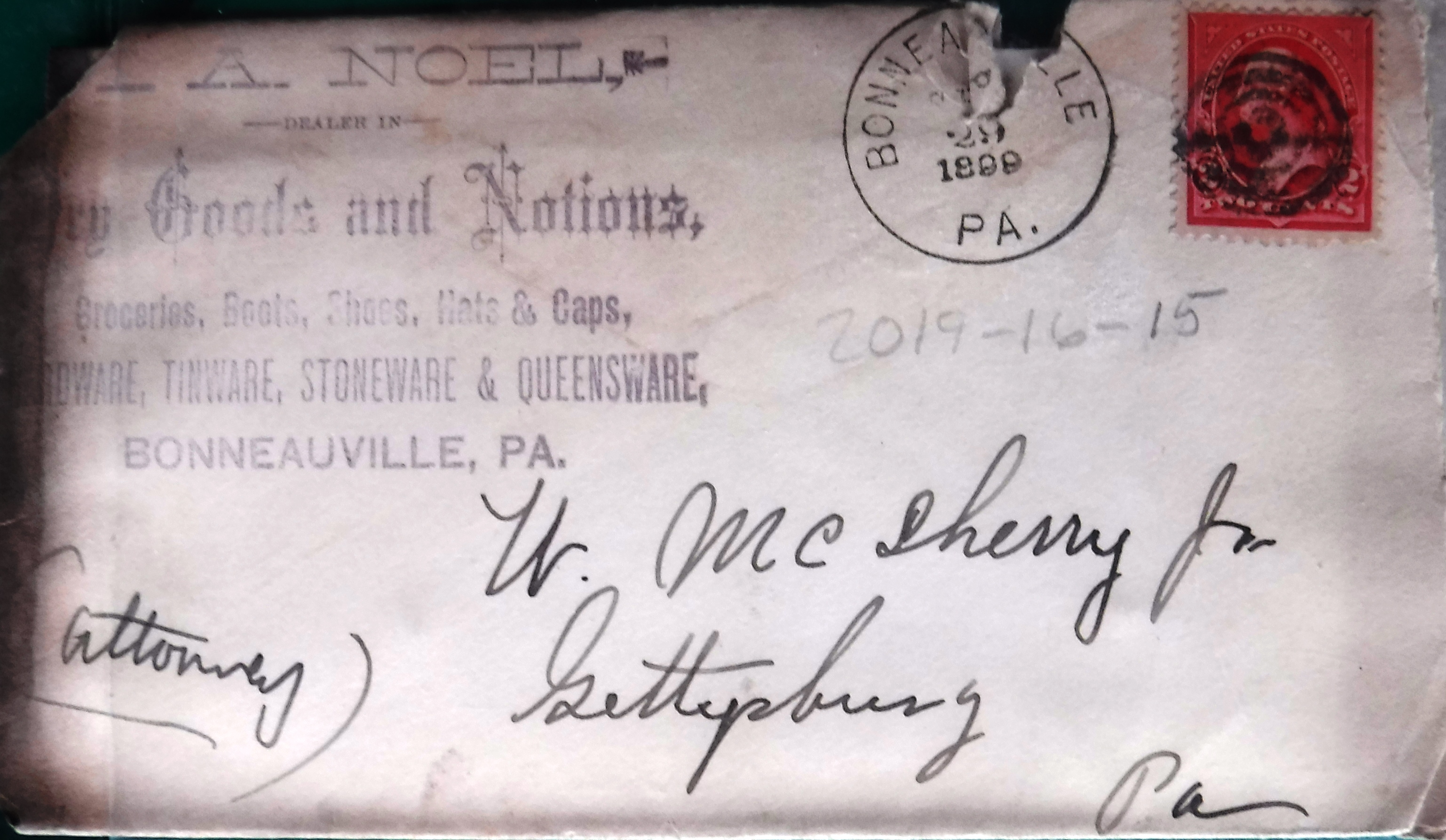 2016-16-15: Letter: W. McSherry/I. A. Noel. Re: Financial matters. Note stamped advertising on Envalope: "I. A. Noel, Dealer in Dry Goods and Notions, Groceries, Boots, Shoes, Hats and Caps, Hardware, Tinware, Stoneware & Queensware, Bonneauville, PA.