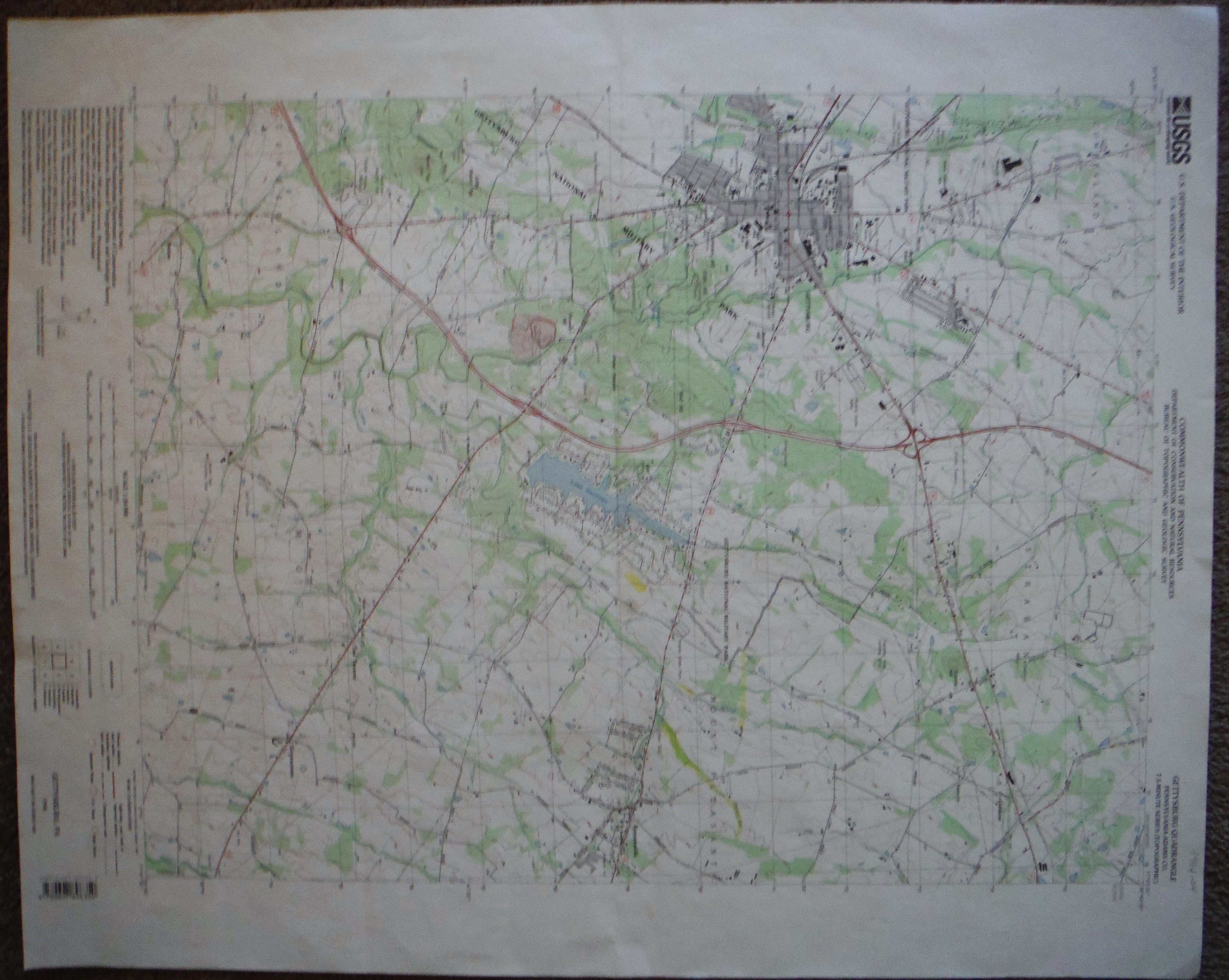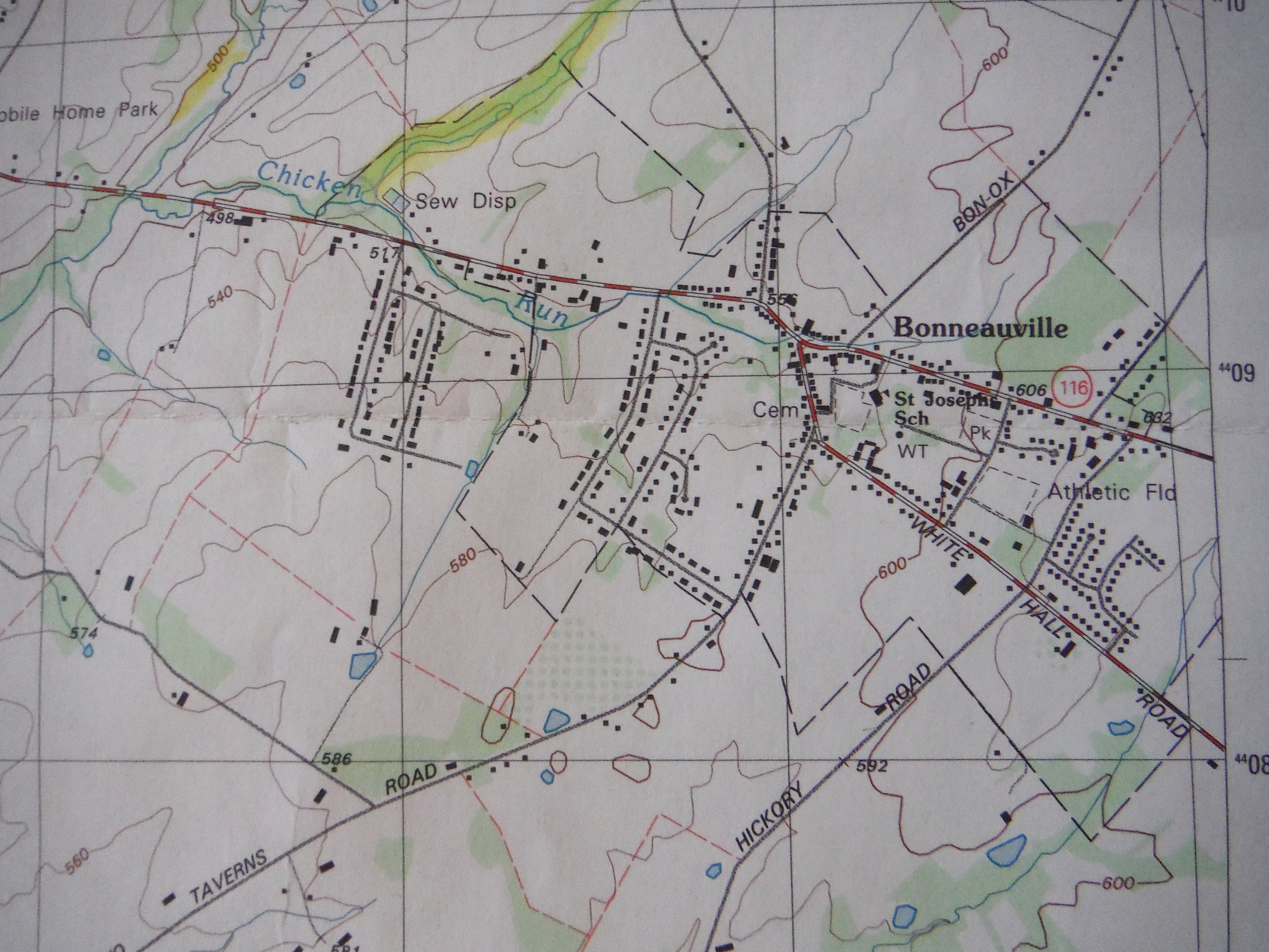 This USGS topo map shows Bonneauville structures. geological features, roads, municipal boundaries, woodlots and elevations in 1994.