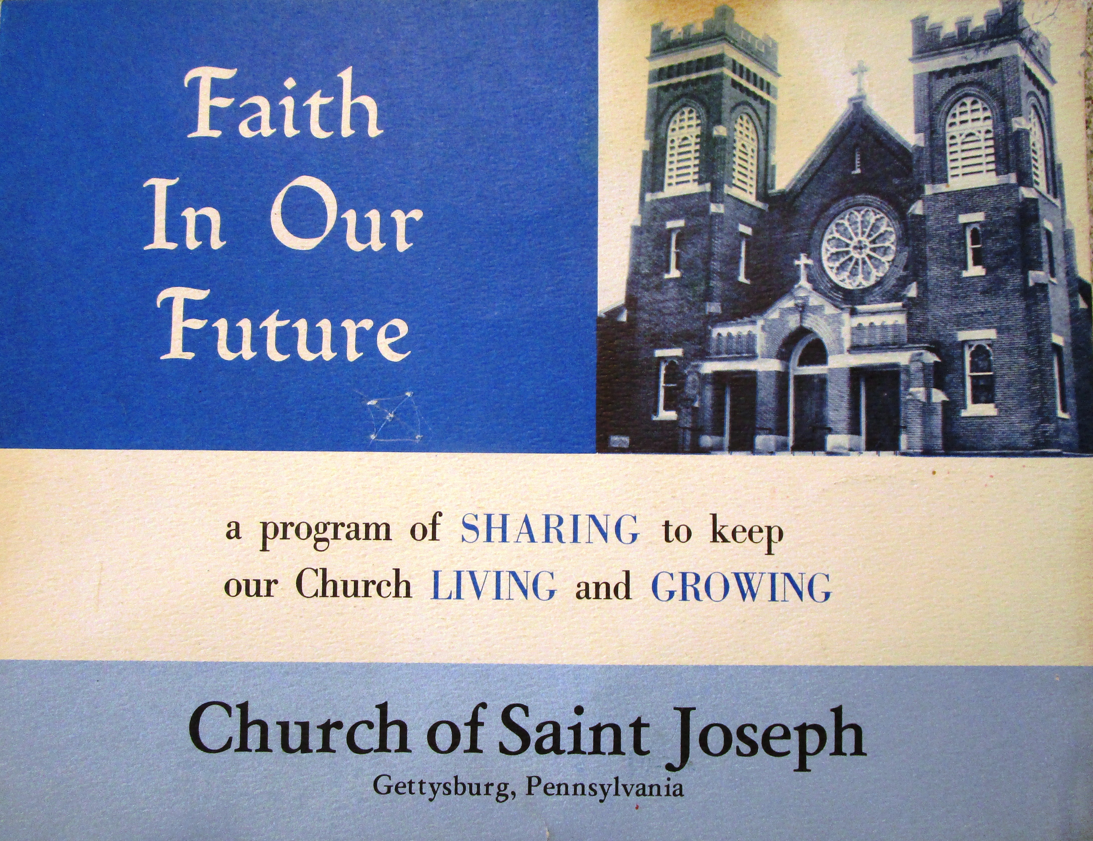 This undated four page brochure is a monetary solicitation vehicle employed during a time of financial need for "The Church of Saint Joseph, Gettysburg, (Bonneauville) PA." Through it, parishioners were encouraged to purchase "shares" in the church.