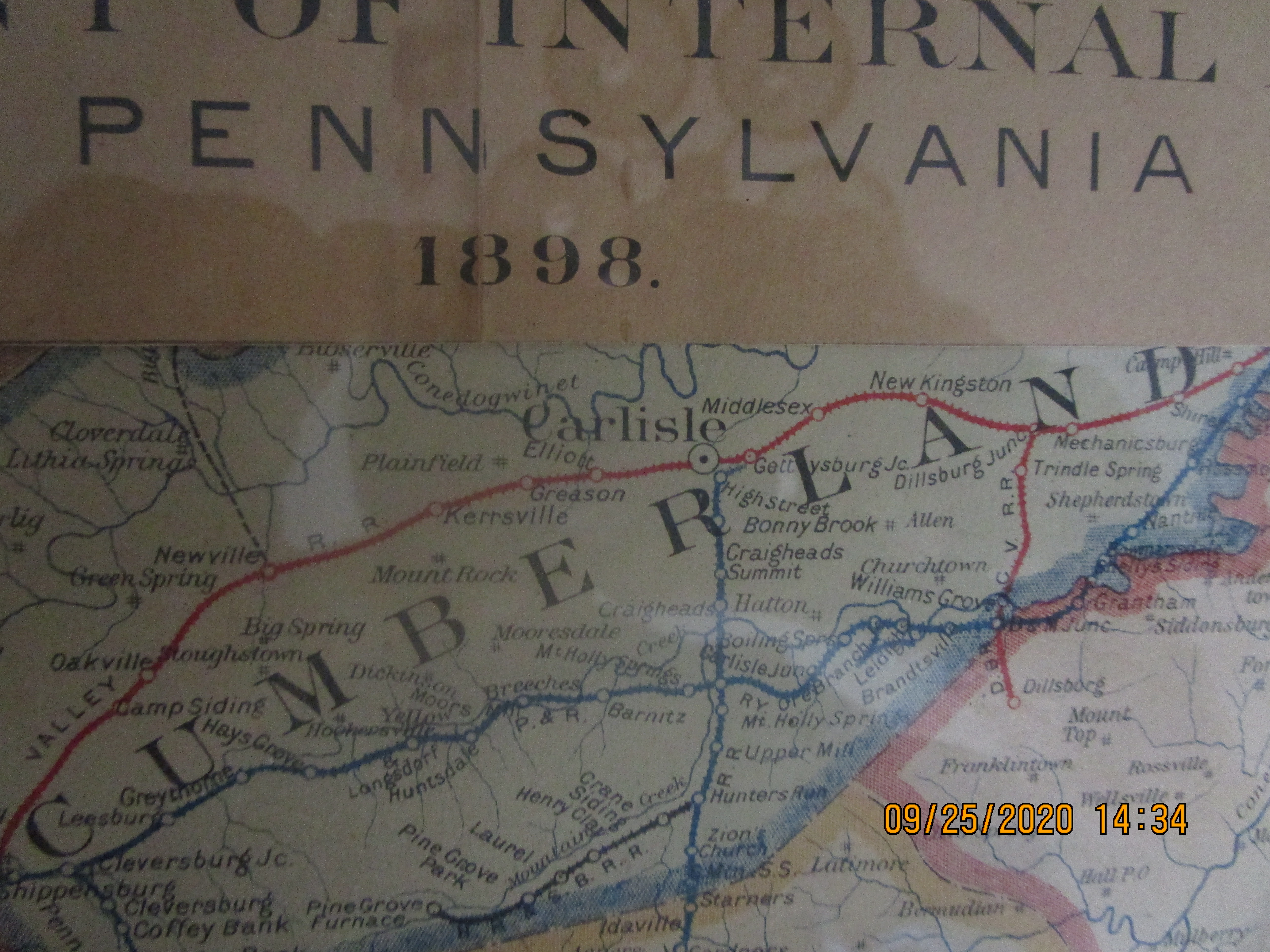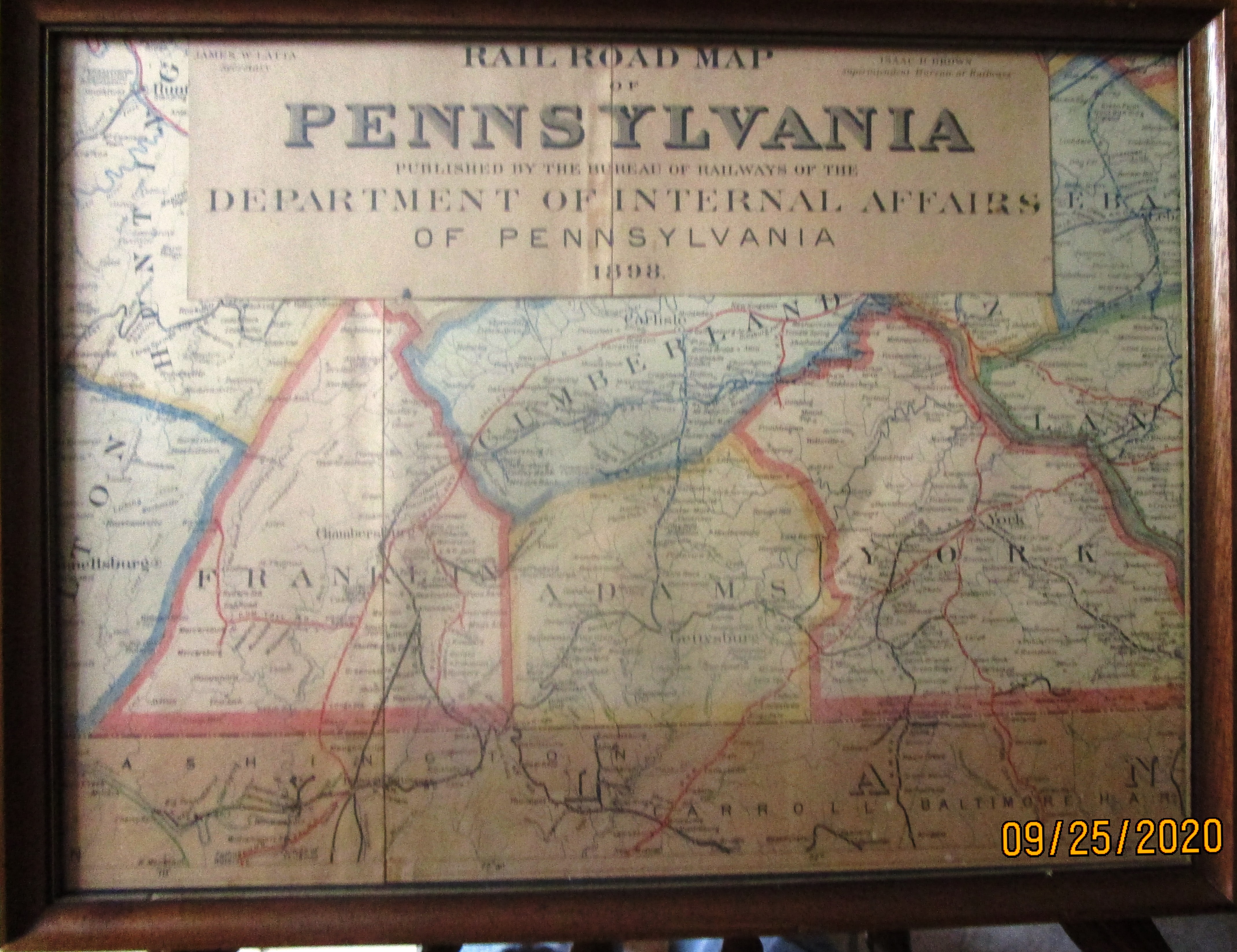 This is a framed portion of an 1898 "Rail Road Map of Pennsylvania". The map was published by; The Bureau of Railways, Department of Internal Affairs of Pennsylvania. The original was brittle and dilapidated, with portions missing. The map was rolled up upon receipt. Fortunately the center section of the roll, which included Adams and surrounding Counties, was best preserved.