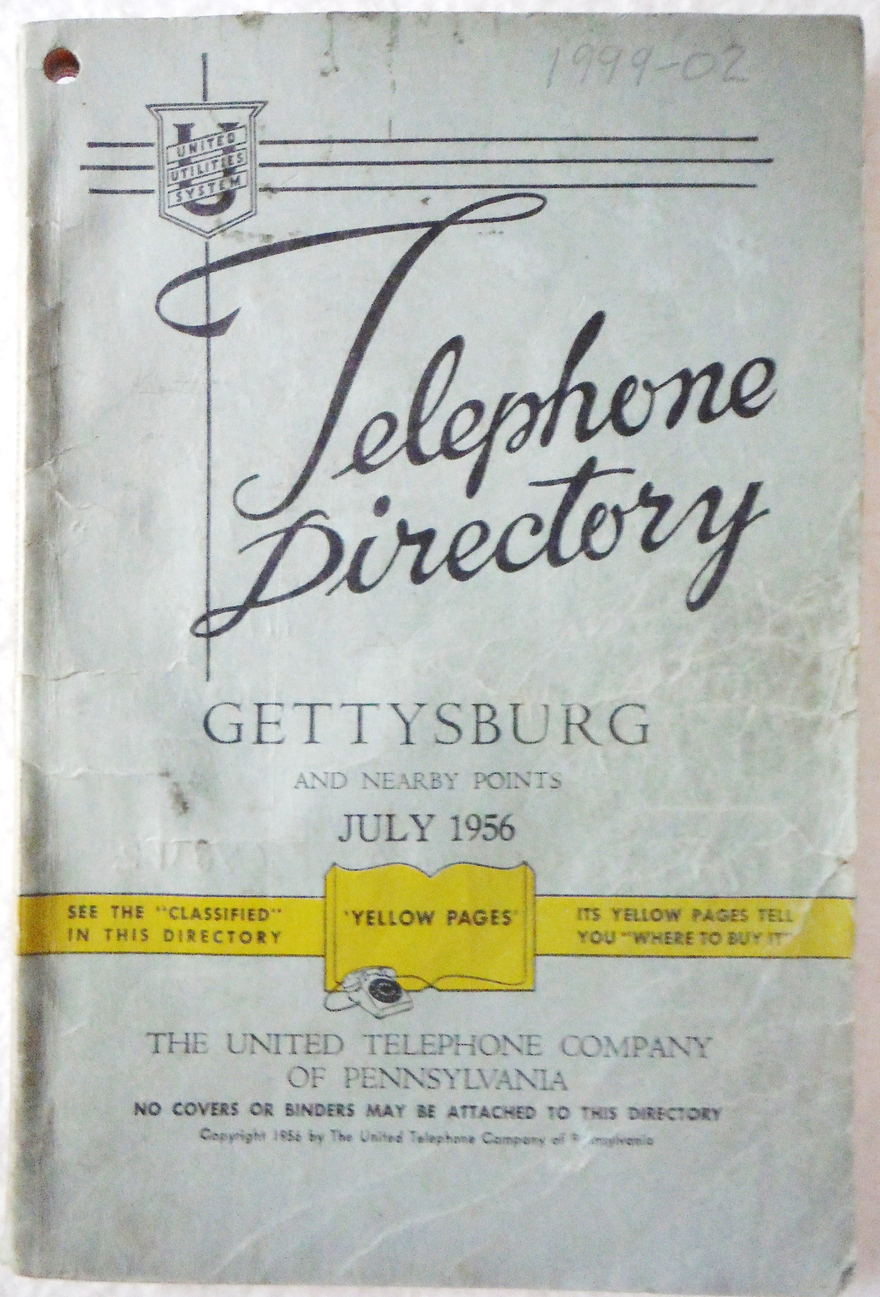 This 1956, United Telephone Co. book contains telephone numbers and addresses for individuals of Bonneauville. The yellow pages section lists Bonneauville businesses including: Weishaar Bros. Appliances, Weaver's Antique Shop, Rev. Leo J. Krichten, Orndorff Bros. Contractors, Storm's Garage, Roger R. Weaver Groceries, Bonneauville Hotel, Gray Goose Inn, Golden's Cities Service Station and Orndorff's Service Station.